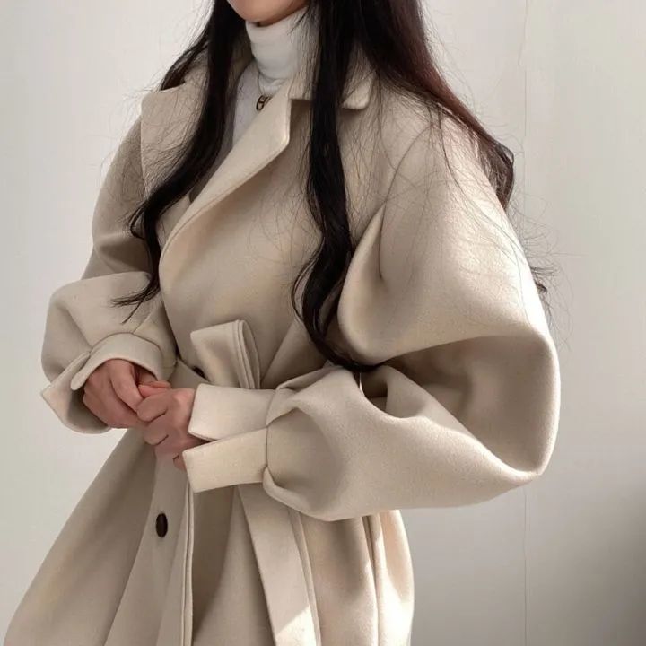 새로운 한국 스타일 세련된 가을과 겨울 느슨한 바람 코트 여성 모직 원피스 칼라 작은 여성을위한 중장 모직 코트스토어 가기