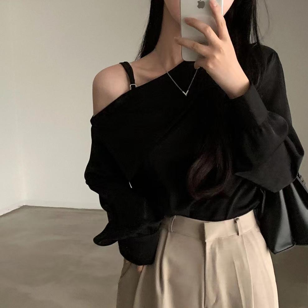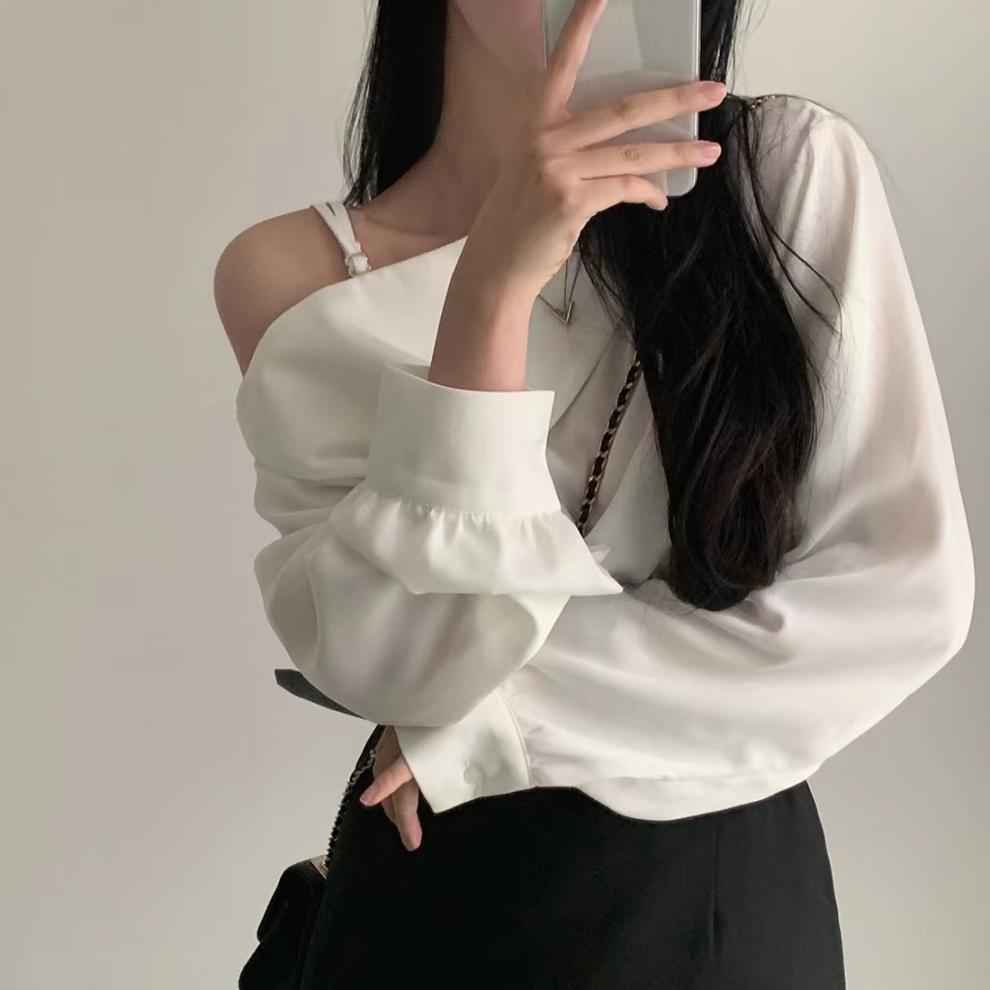 한국 이른 봄 디자인 센스 비스듬한 칼라 스트랩 오픈 숄더 큰 랩 느슨한 슬리밍 랜턴 슬리브 쉬폰 셔츠스토어 가기