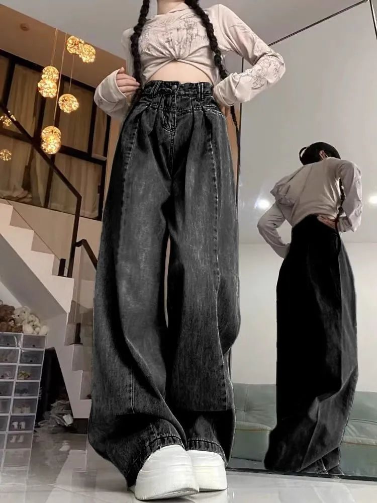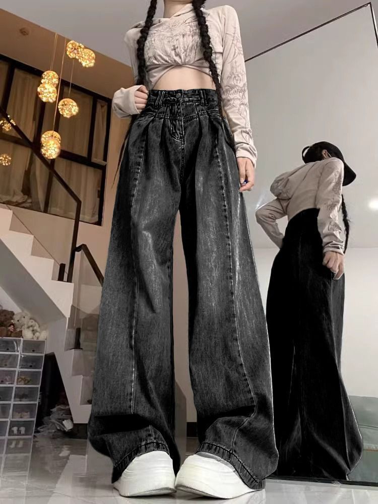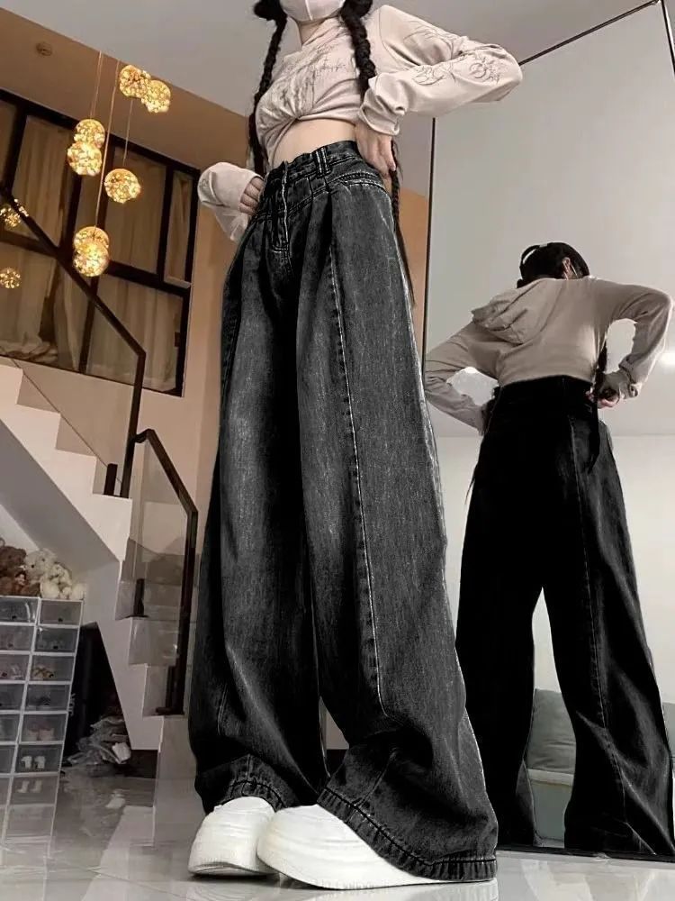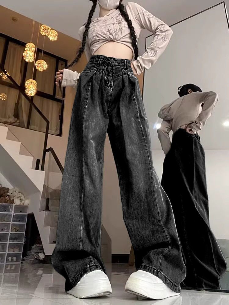 아메리칸 스타일 블랙 그레이 와이드 레그 청바지 여성의 봄과 여름 새로운 느슨한 높은 허리 올매치 스트레이트 트렌디 바지