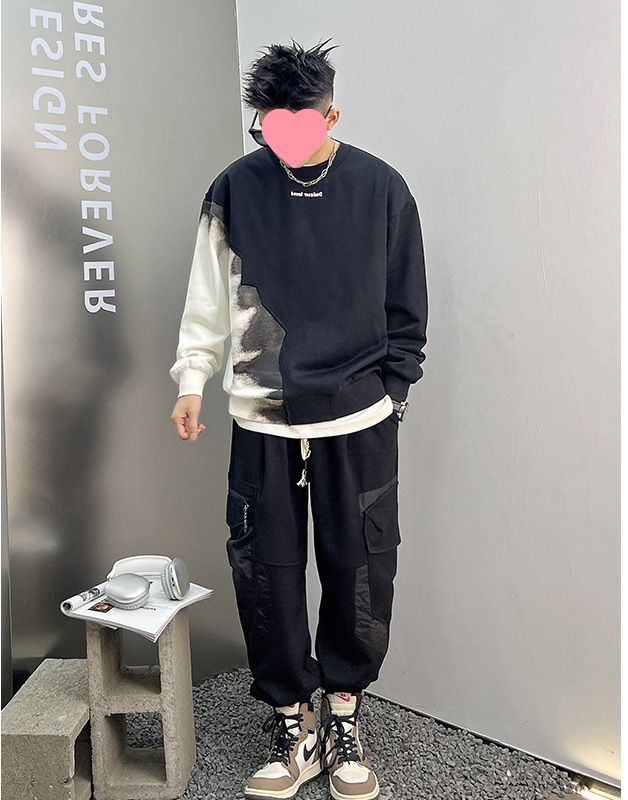 2025 봄과 가을 흑백 그라디언트 라운드 넥 스웨트 남성용 루즈 후드 중공업 남성용 트렌디 탑