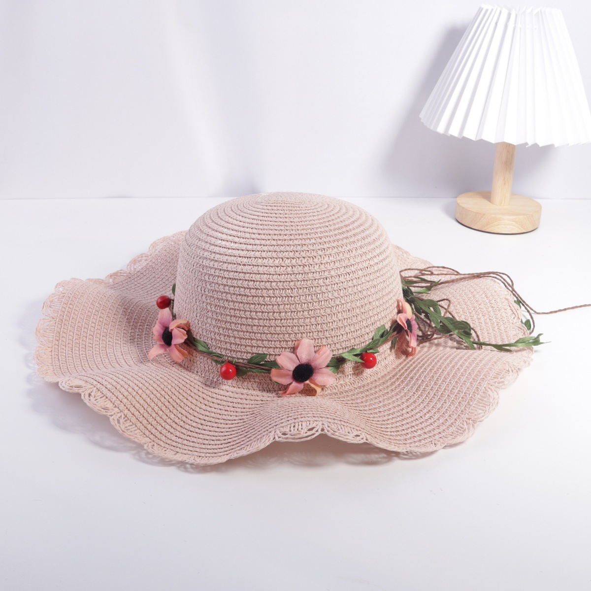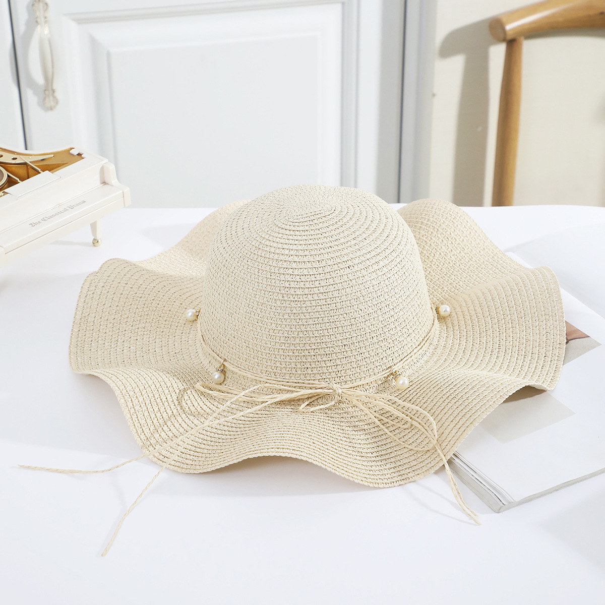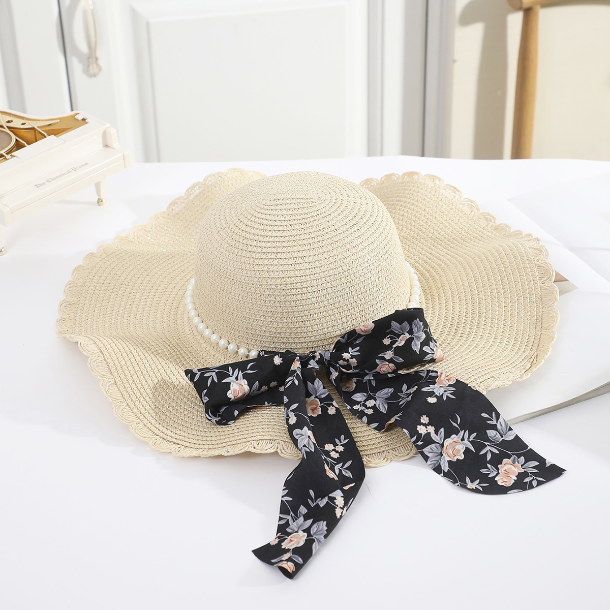 • 성인 진주 꽃무늬 검은 리본 연잎 모자 쌀