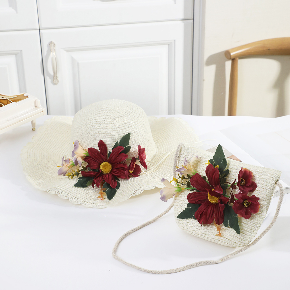 • 성인 부르고뉴 인공 꽃 연잎 모자 흰색