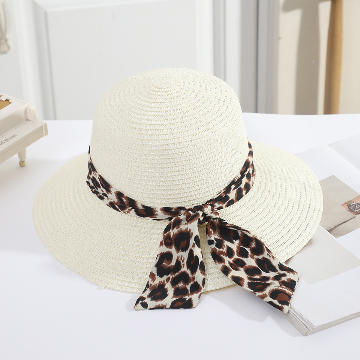 • 성인 표범 도트 리본 분지 모자 흰색