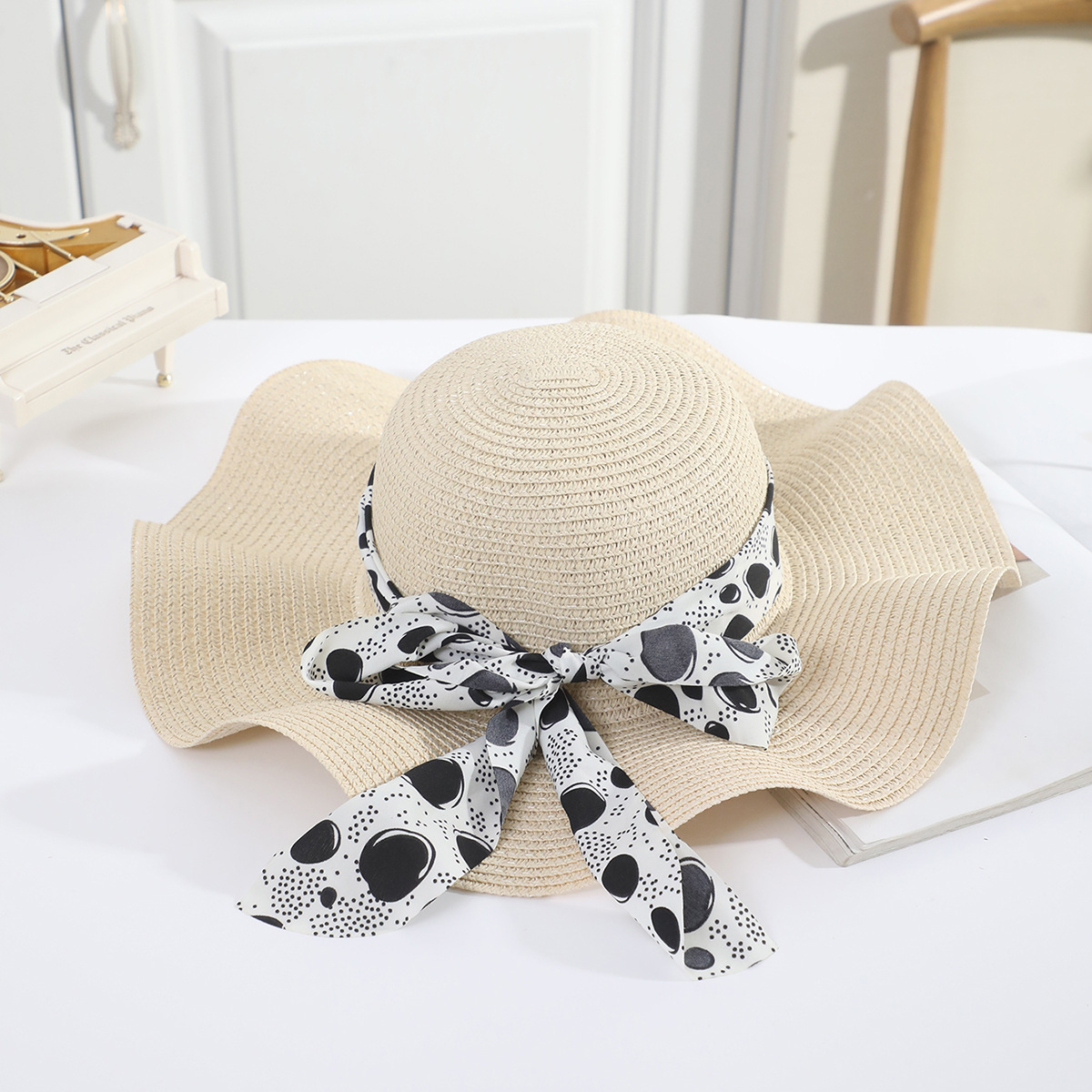 • 성인 진주 꽃무늬 블랙 리본 연잎 모자 화이트