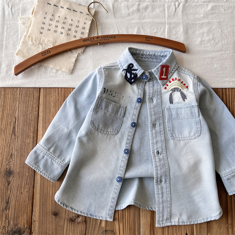[재고] 일본 어린이복 중봄 어린이 옛날 워시 화이트 자수 데님 셔츠
