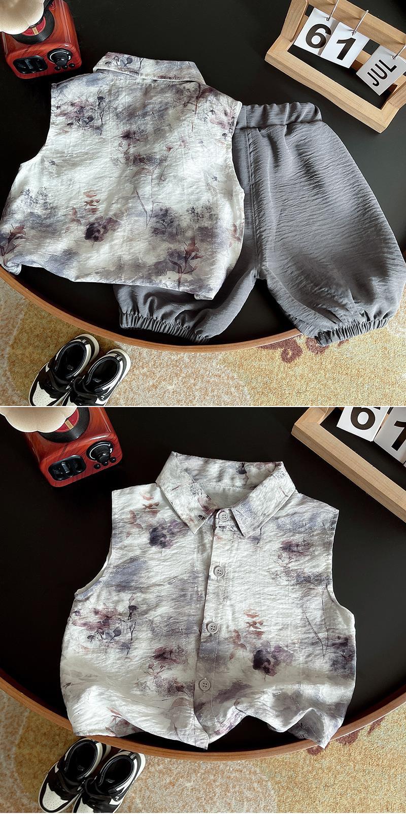 소년 소녀 패션 캐주얼 민소매 셔츠 조끼 투피스 세트를위한 어린이 여름 세트 도매 타이 염료 인쇄 아동복