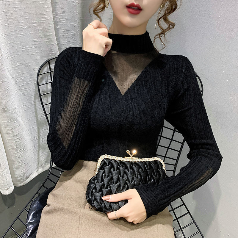 검은 레이스 가을과 겨울 내부 반 높은 칼라 얇은 스웨터 여성의 새로운 복장 유행 니트 베이스 셔츠 최고 트렌디