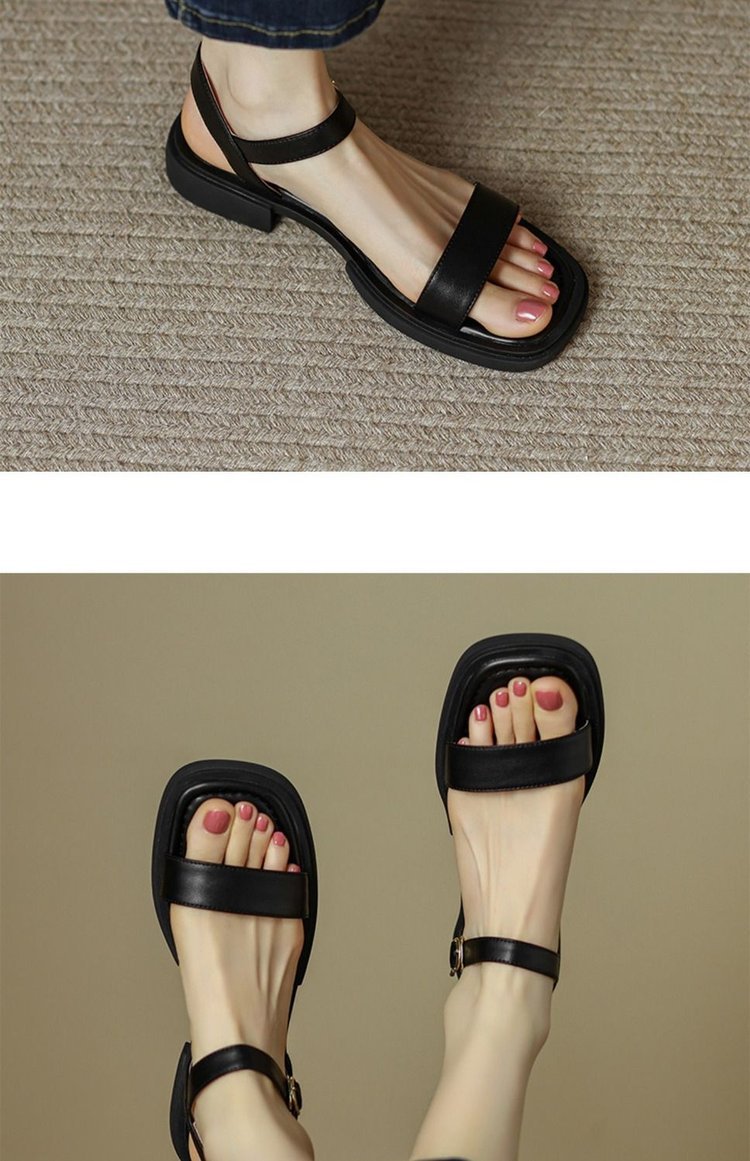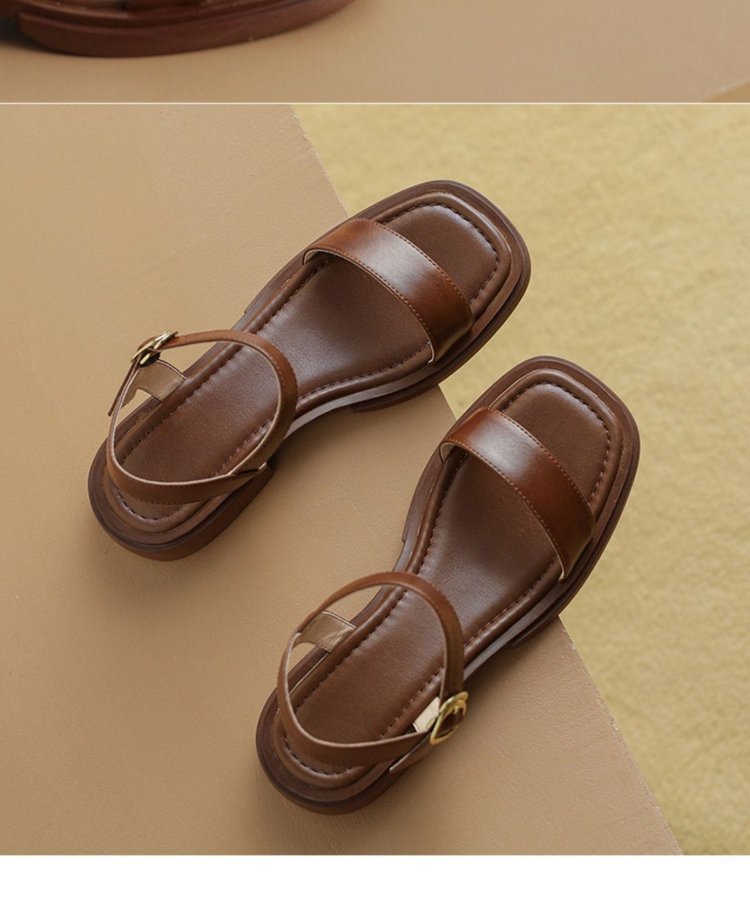 대외 무역 플러스 사이즈 프랑스 복고풍 다크 브라운 샌들 로우 힐 로마 신발 오픈 토 스트랩 간단한 편안한 플랫 여성 신발