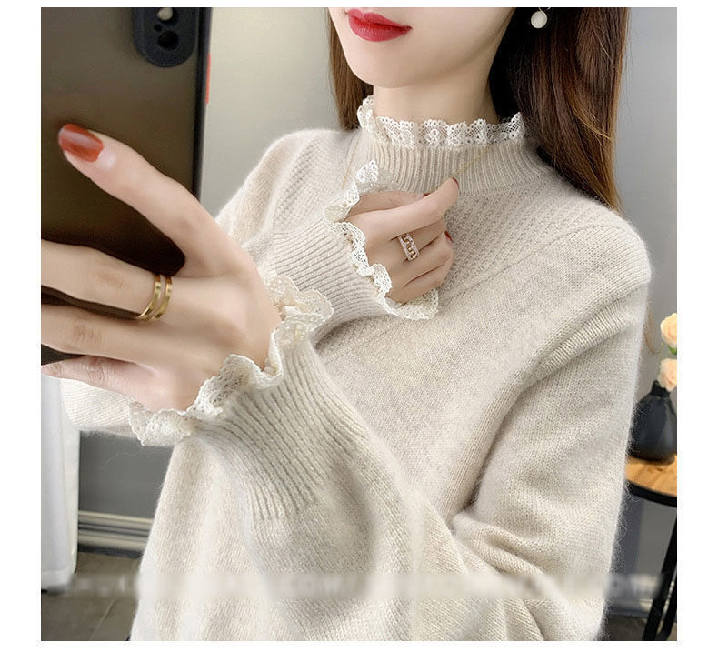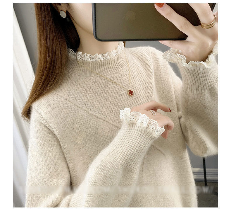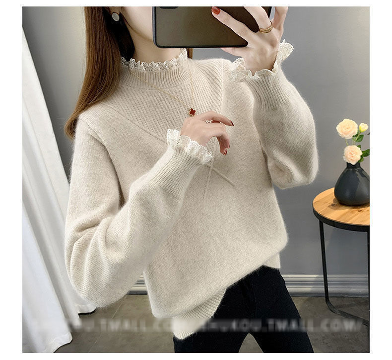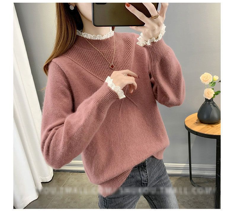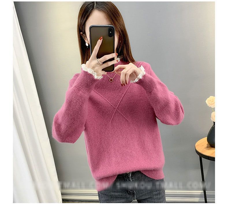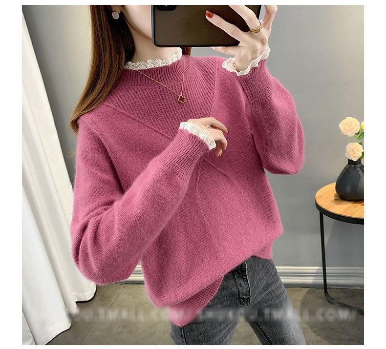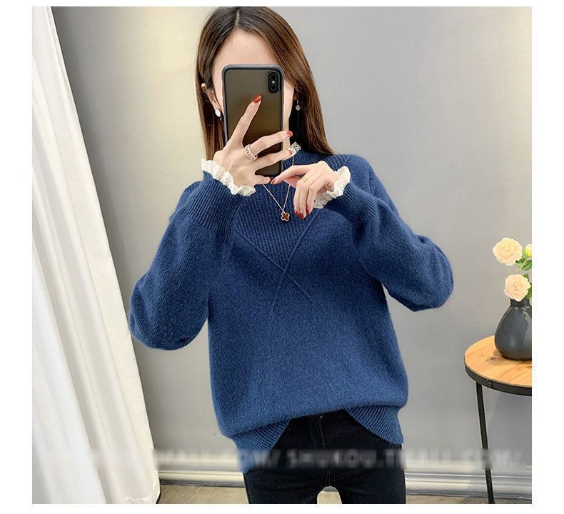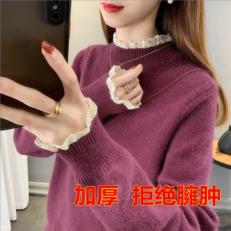 두꺼운 스웨터 가을과 겨울 새로운 하프 터틀넥 레이스 스티칭 니트베이스 셔츠 여성용 내부 입고 외국 스타일