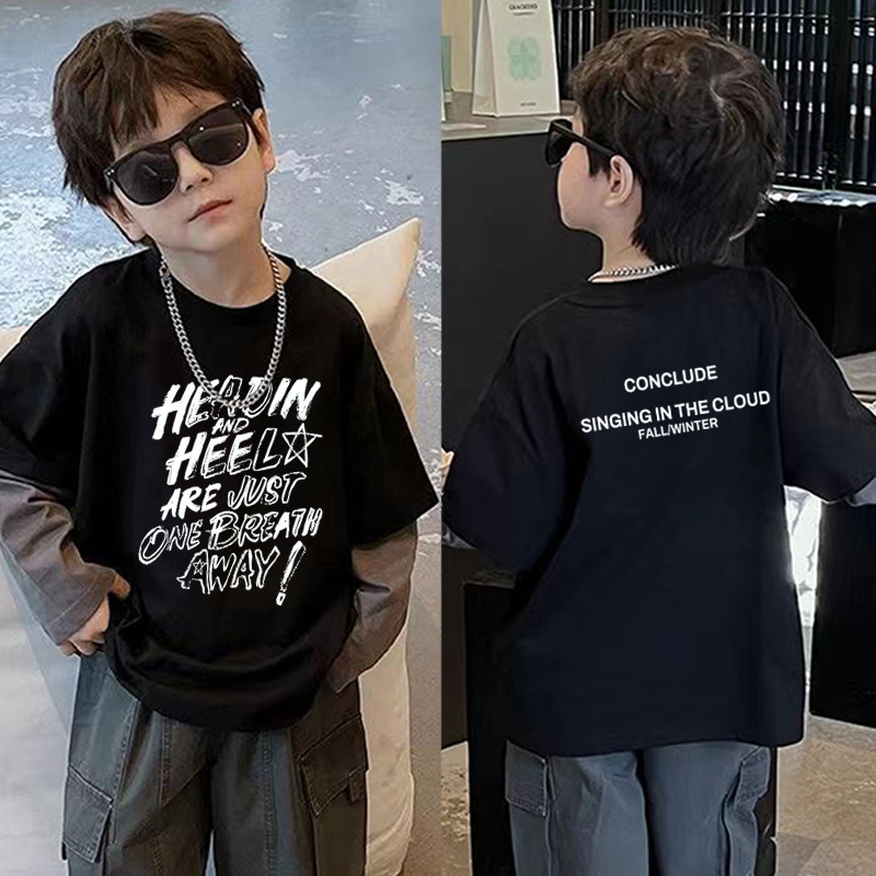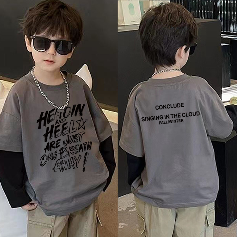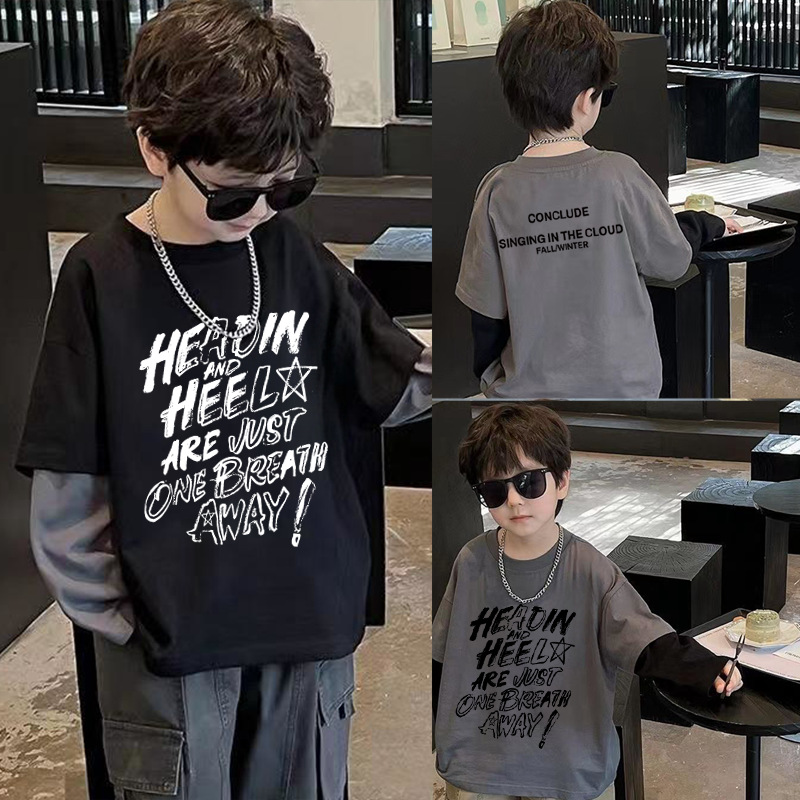 어린이 봄과 가을의 새 한국어 버전 코튼 긴 소매 가짜 투피스 옷 폭발 잘 생긴 소년 바닥 티셔츠스토어 가기