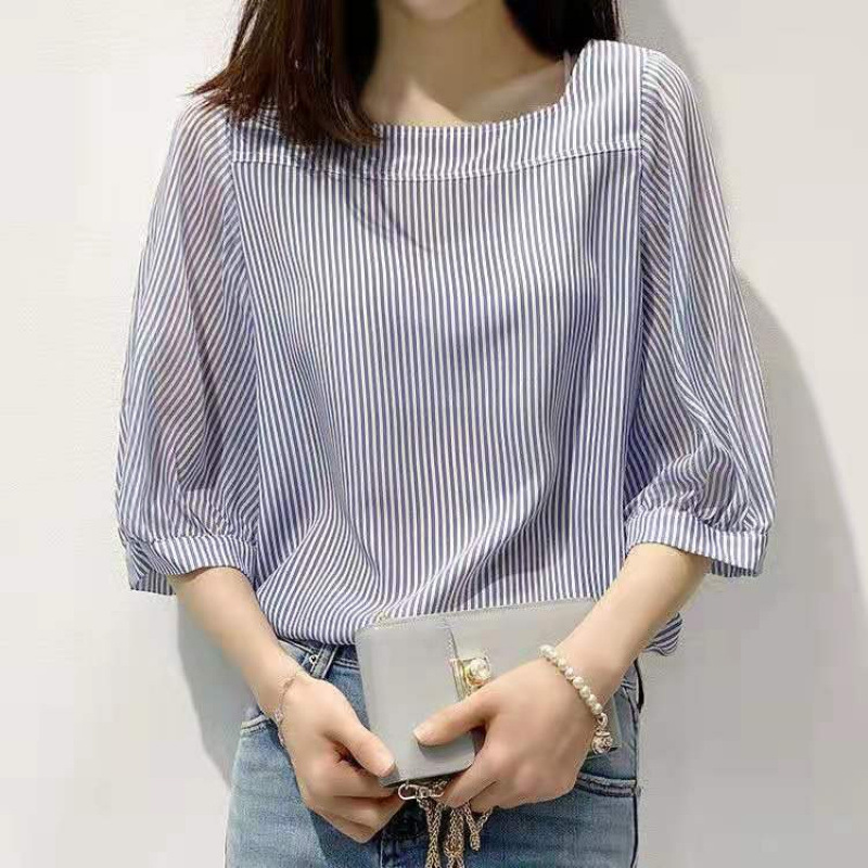 여자 2025 년 여름 새 한국 스타일 스트라이프 루즈 퍼프 슬리브 탑 웨스턴 스타일 쉬폰 셔츠스토어 가기