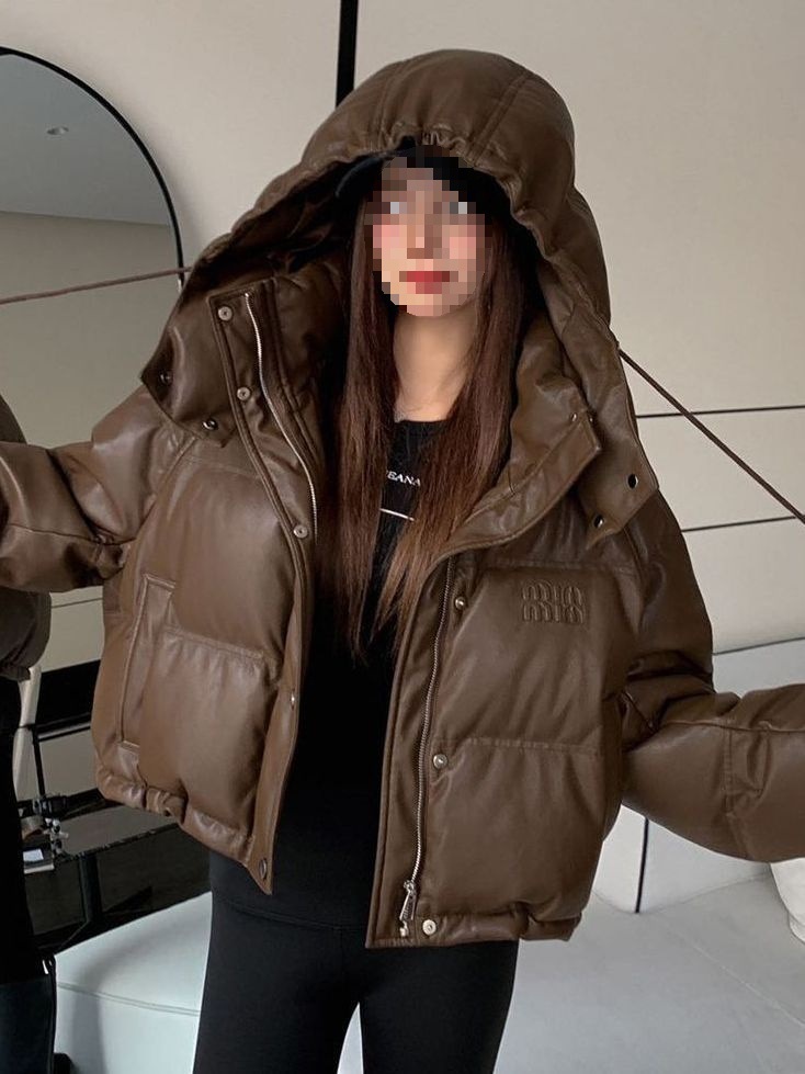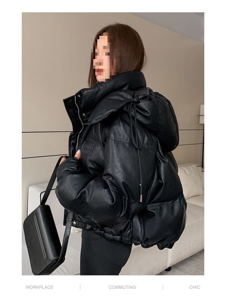 PU 가죽 짧은 워시없는 후드 다운 재킷 여성의 새로운 느슨한 유행 간단한 Maillard 통근 재킷