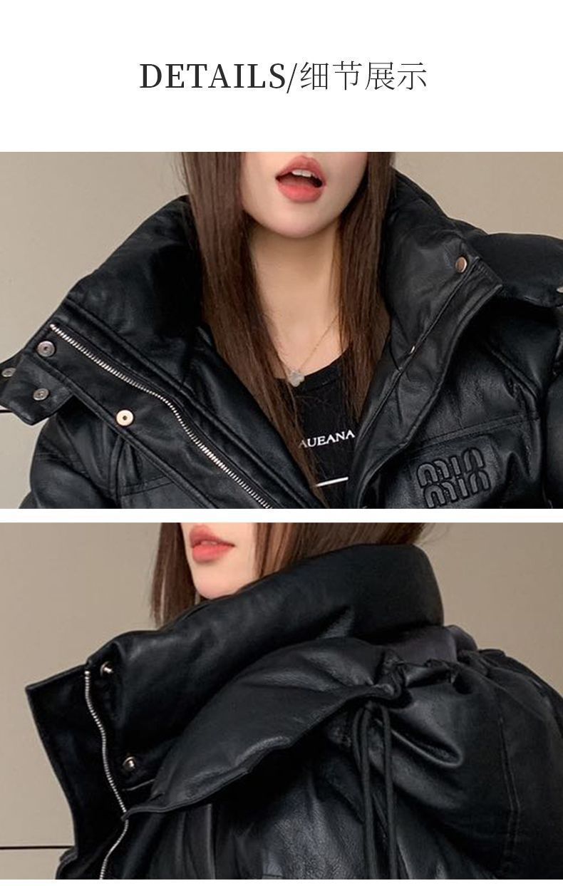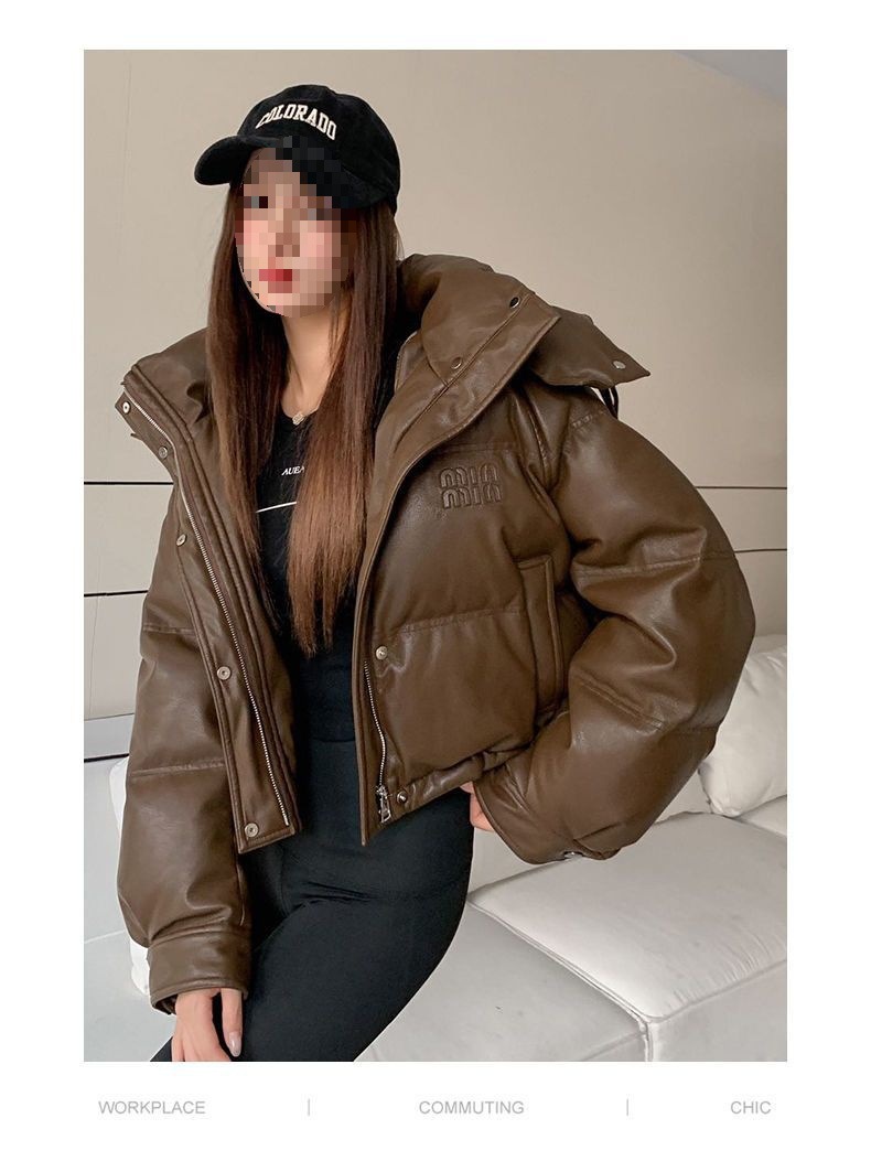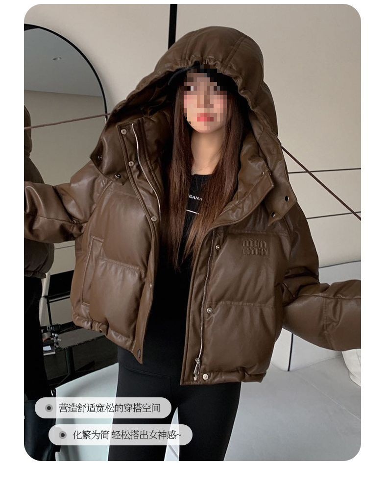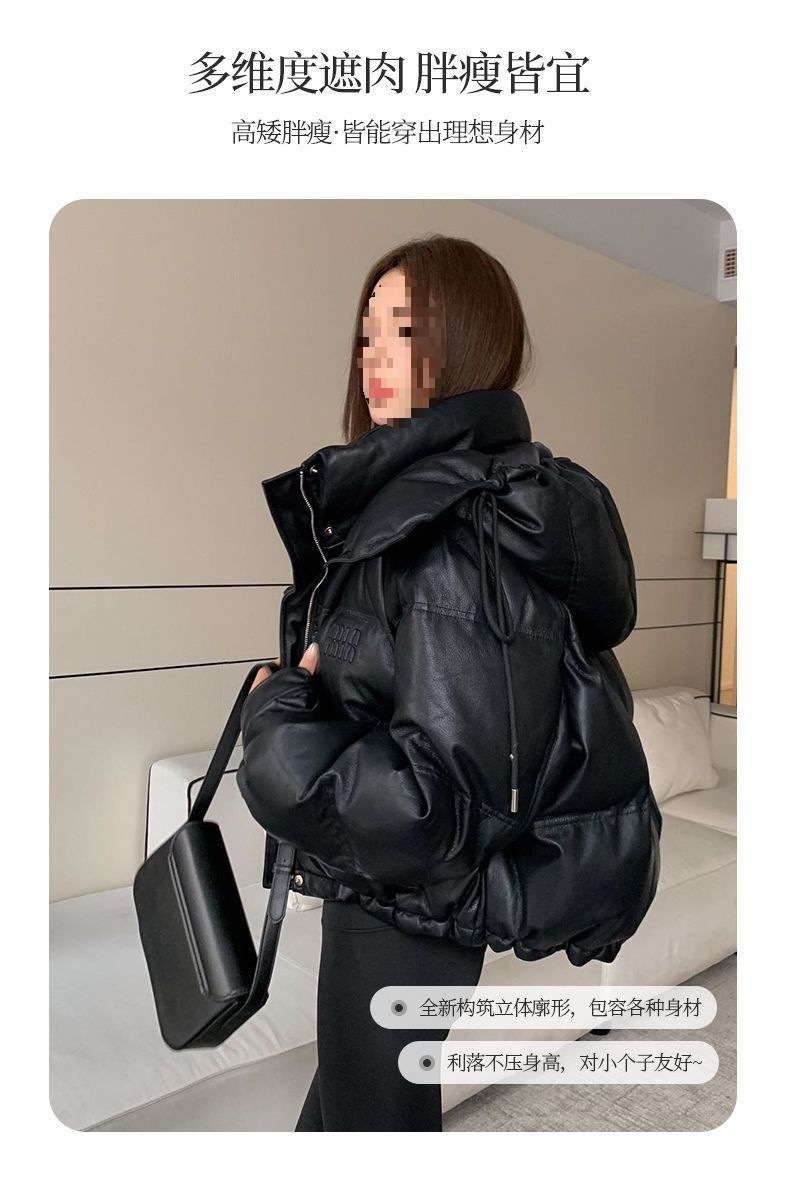 PU 가죽 짧은 워시없는 후드 다운 재킷 여성의 새로운 느슨한 유행 간단한 Maillard 통근 재킷스토어 가기