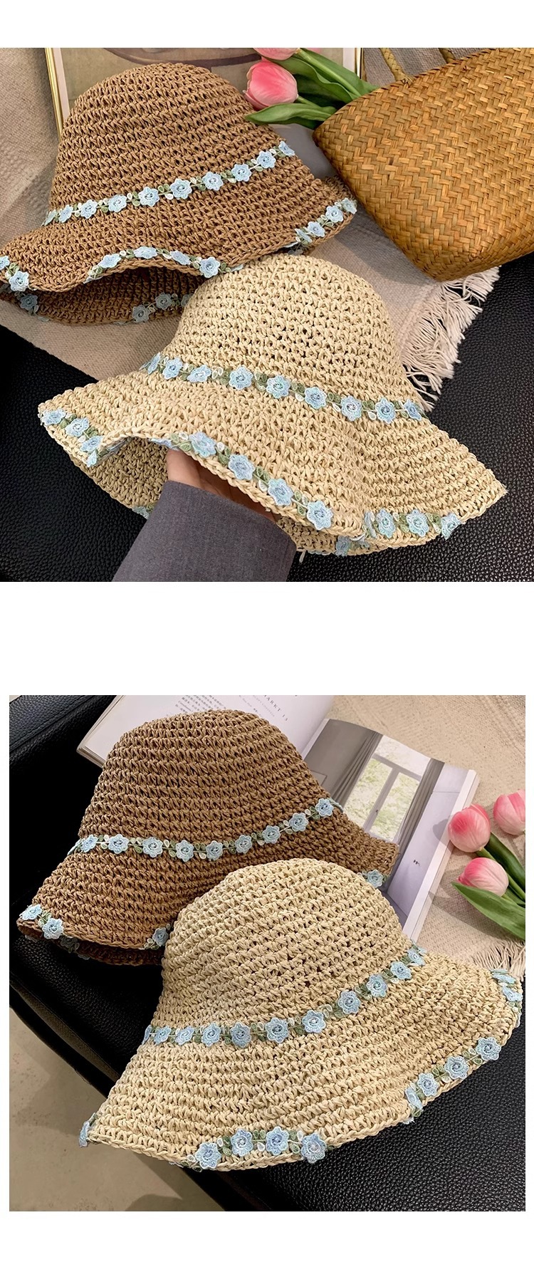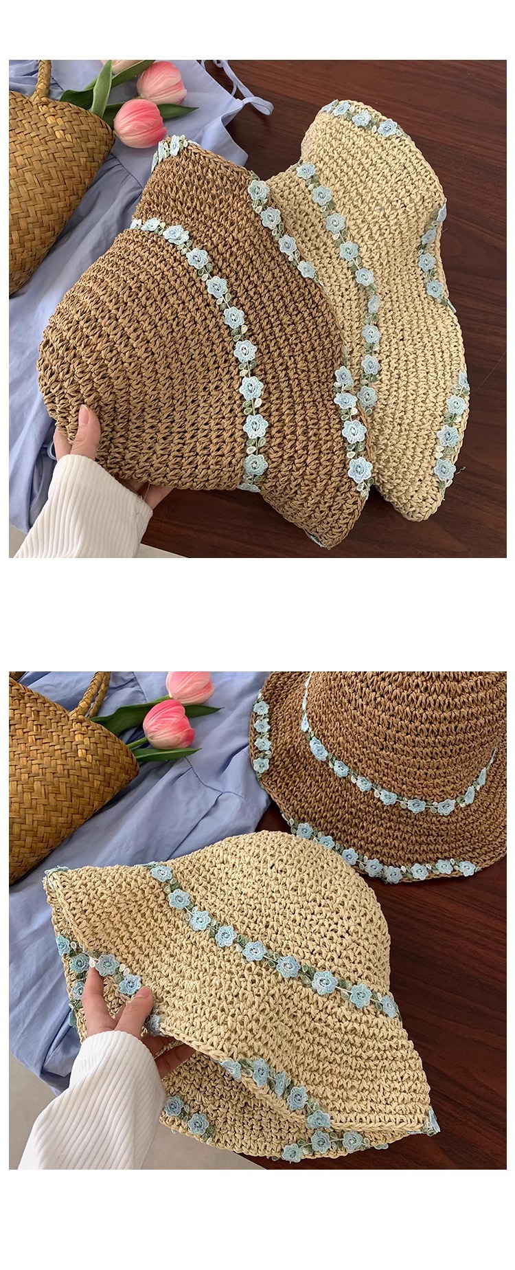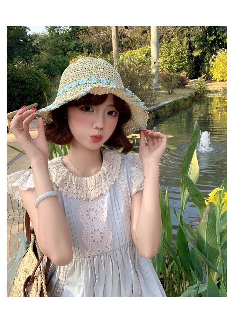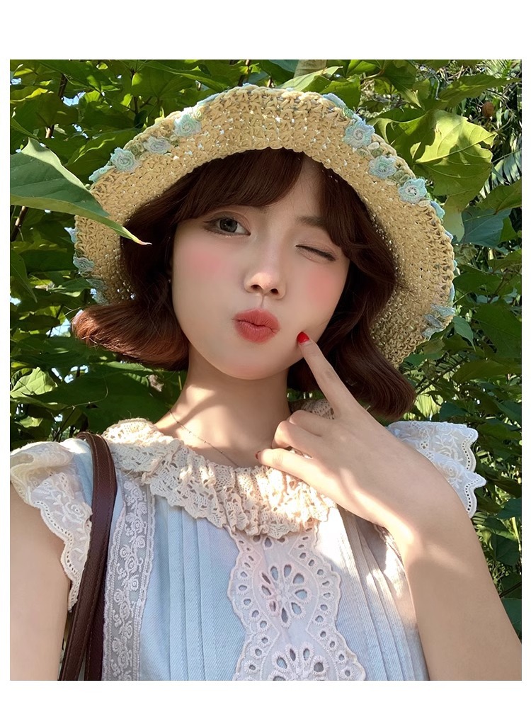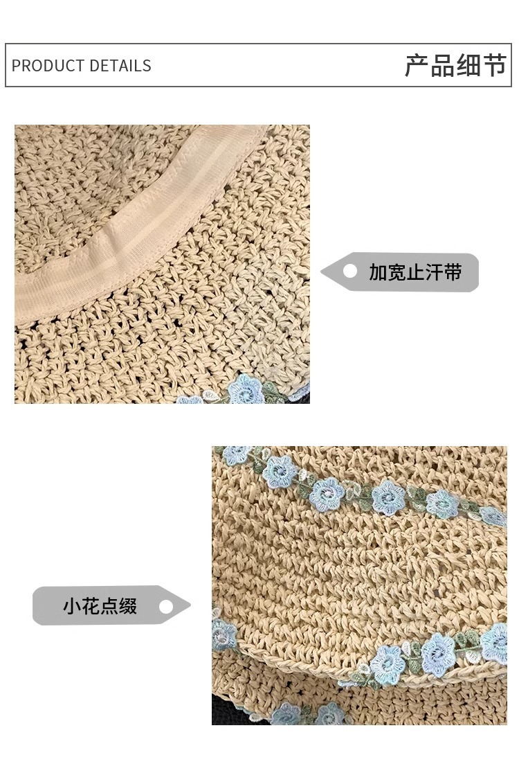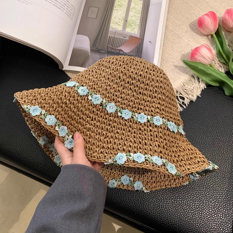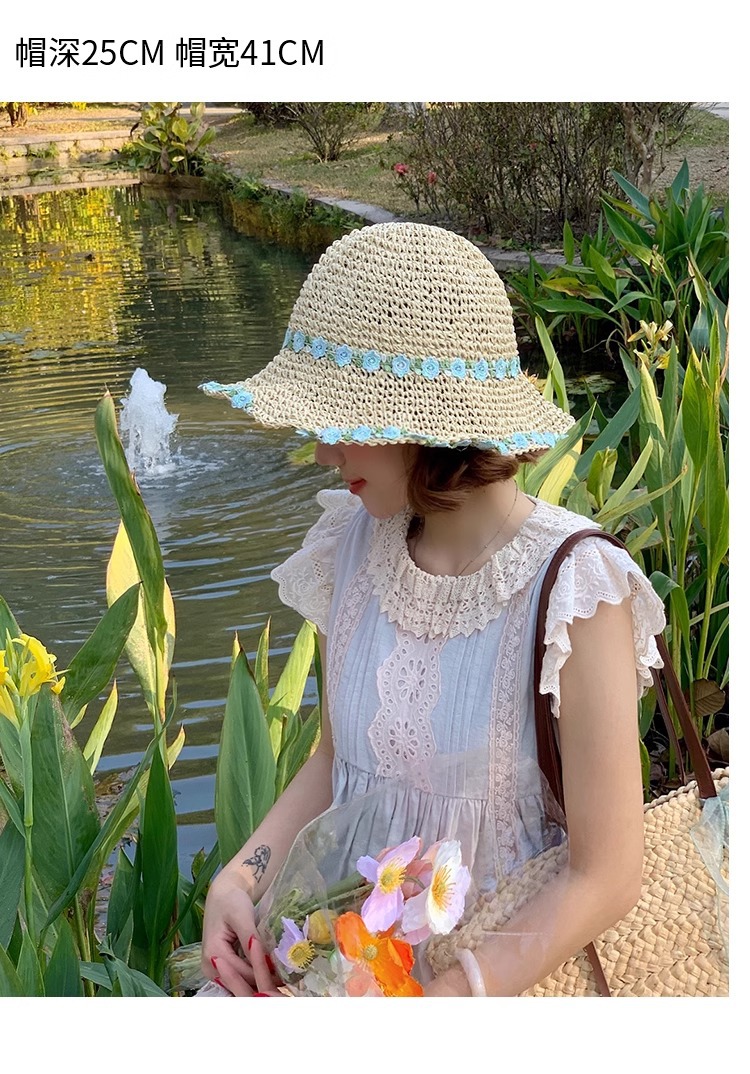 푸른 꽃 짠 어부 모자 여성의 2025 봄 새로운 해변 큰 브림 밀짚 모자 선 스크린 모자