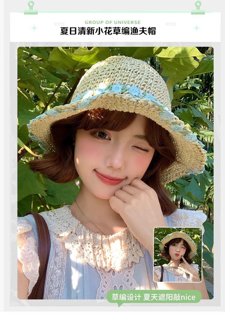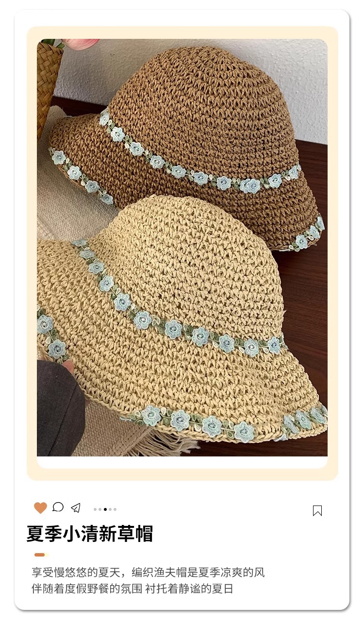 푸른 꽃 짠 어부 모자 여성의 2025 봄 새로운 해변 큰 브림 밀짚 모자 선 스크린 모자스토어 가기