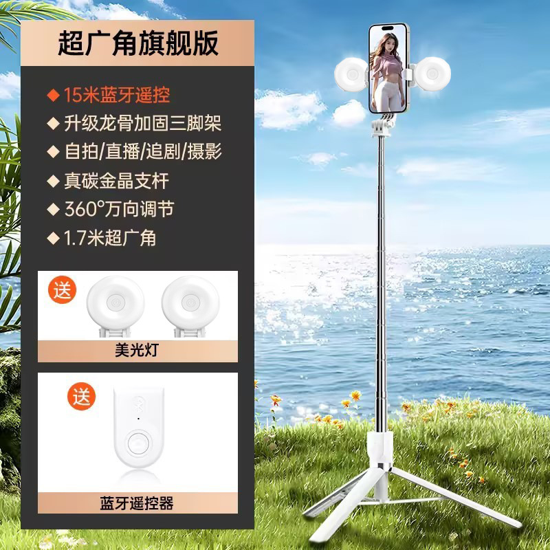 • 스테인리스 셀카봉 화이트 듀얼 소형 조명 모델 [1 본체 셀카봉 + 버튼 배터리 블루투스 리모컨 셀카 + 소형 필라이트 2개]