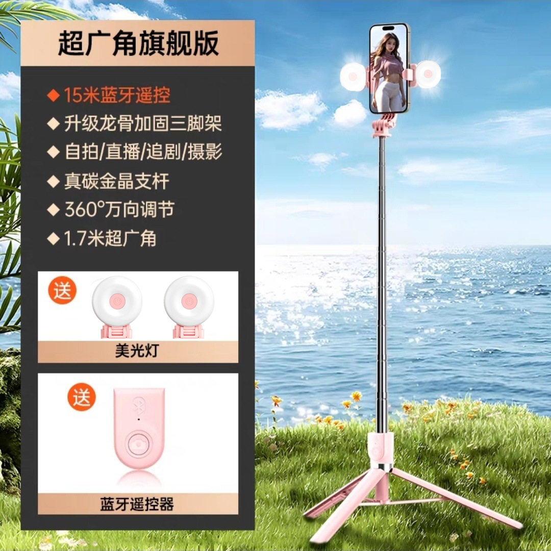 • 스테인리스 셀카봉 핑크 듀얼 소형 조명 모델 [1 본체 셀카봉 + 버튼 배터리 블루투스 리모컨 셀카 + 소형 필라이트 2개]