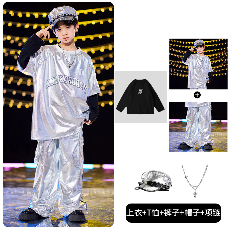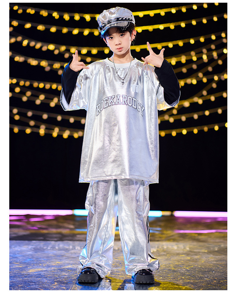힙합 어린이 패션 의류 멋진 잘 생긴 실버 밝은 컬러 퍼포먼스 의류 남자 Hiphop 재즈 댄스 힙합 루즈 드럼 세트스토어 가기