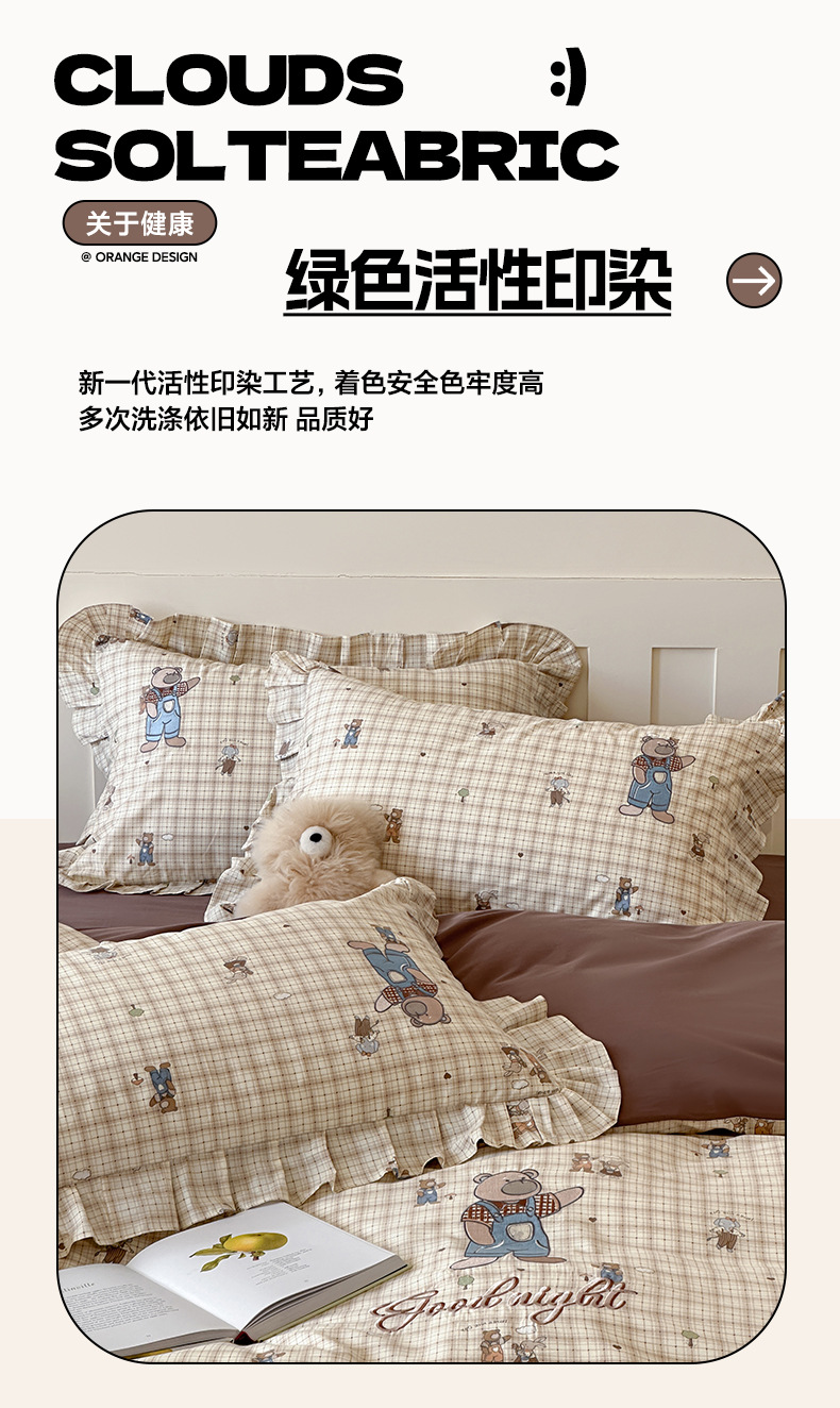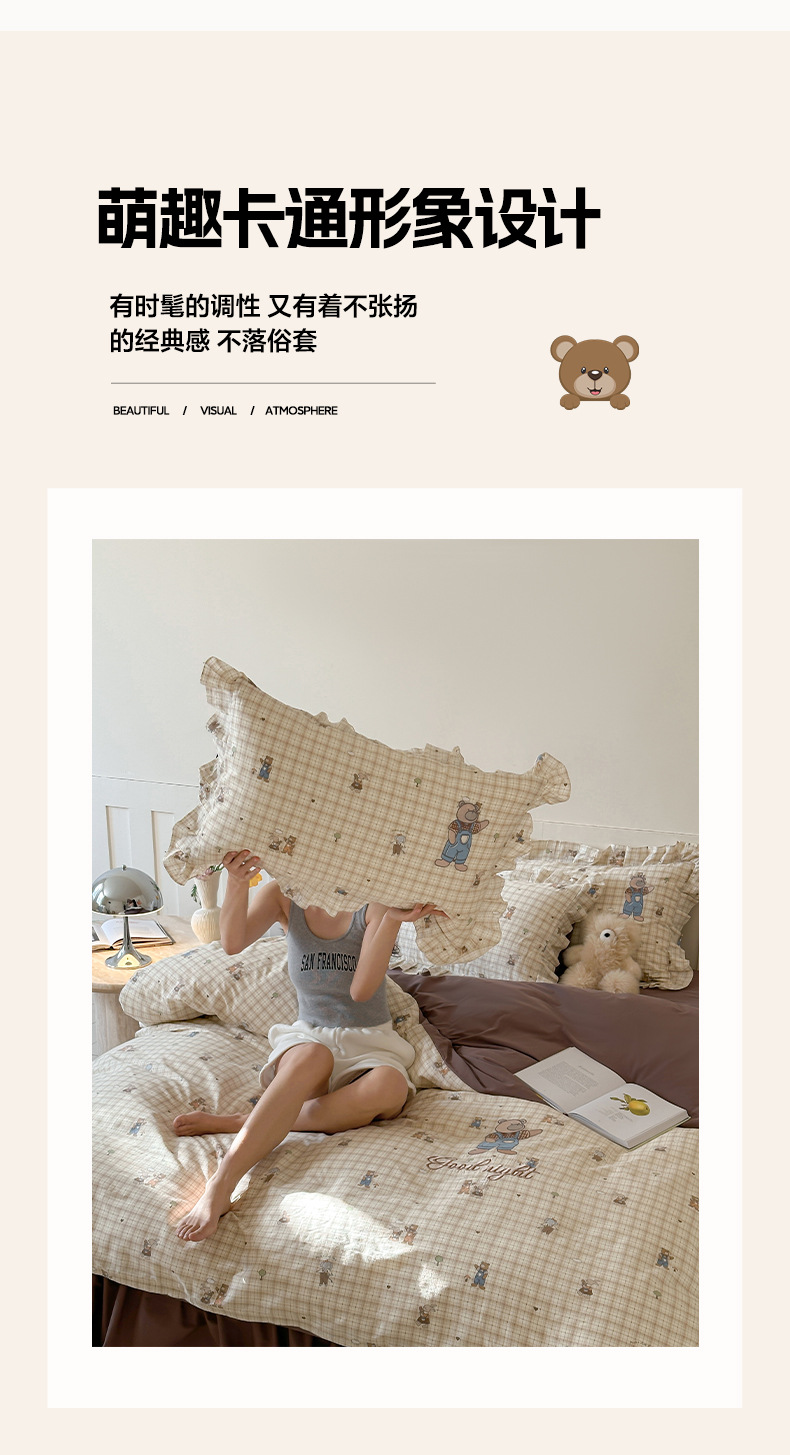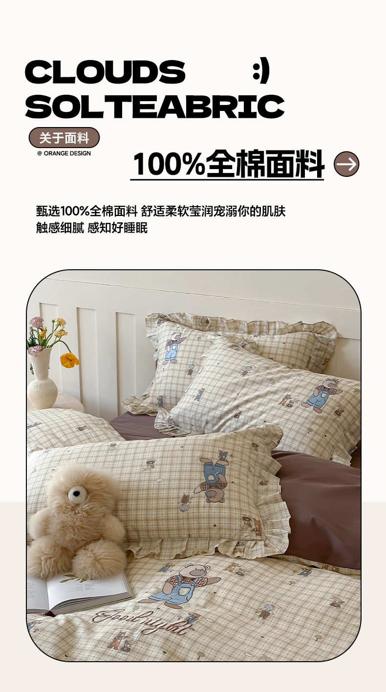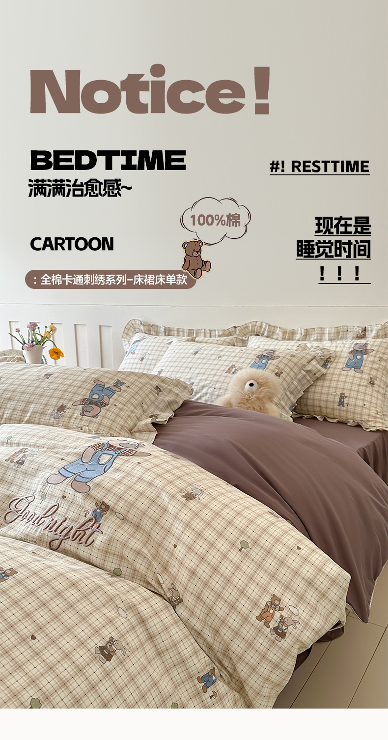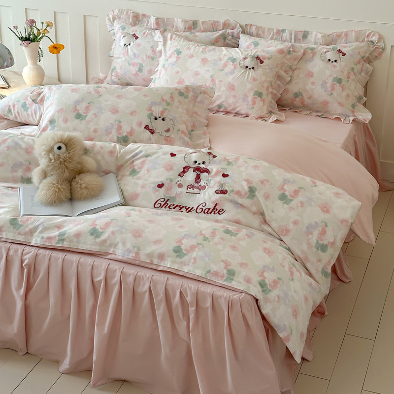 INS 코튼 만화 4 피스 자수 러플 코튼 베드 스커트 3 피스 침구 시트 퀼트 커버