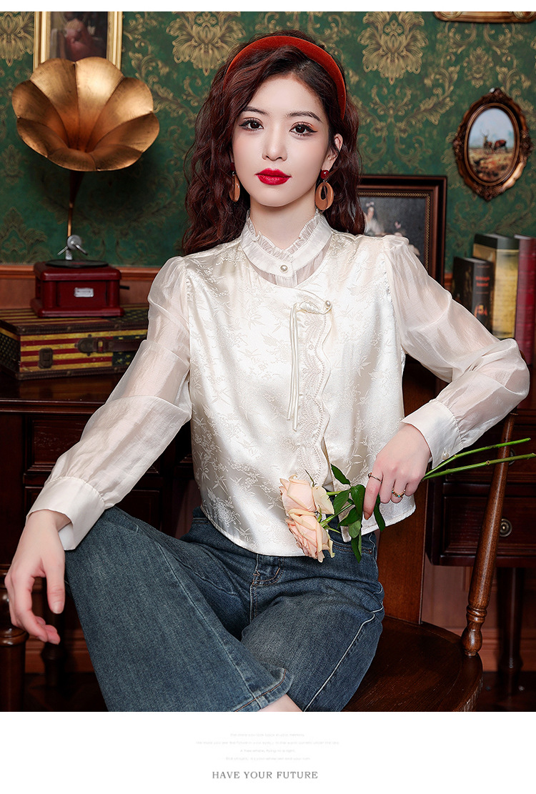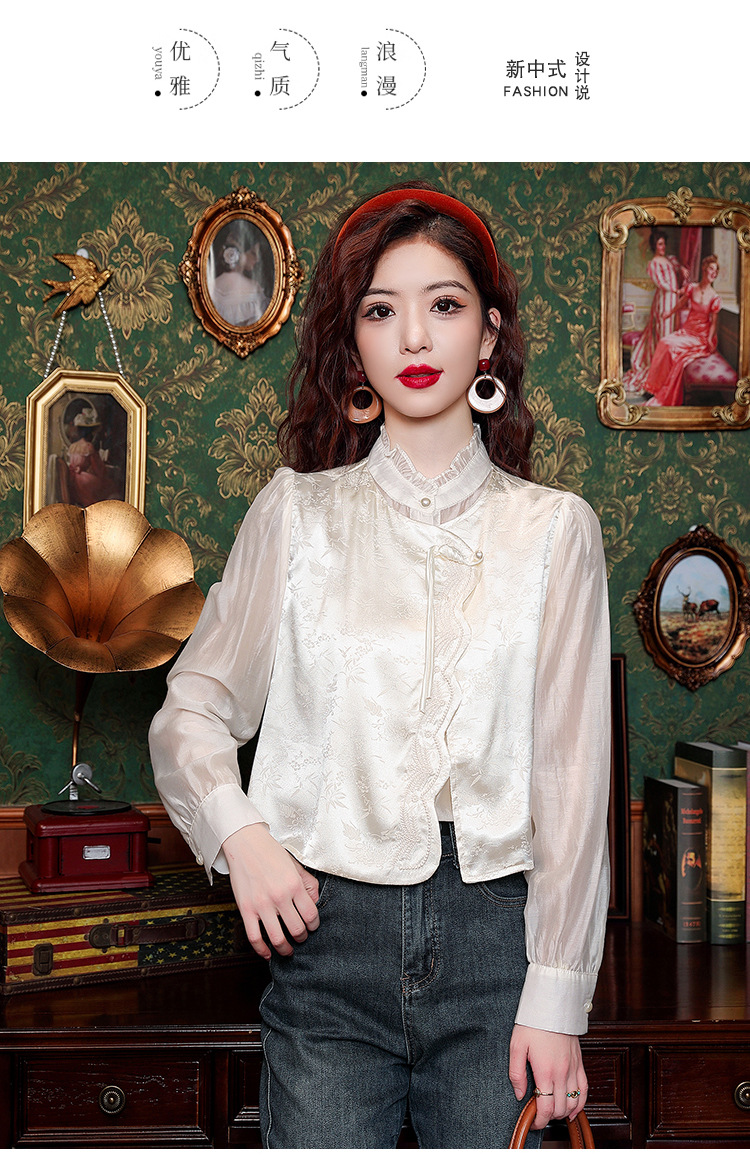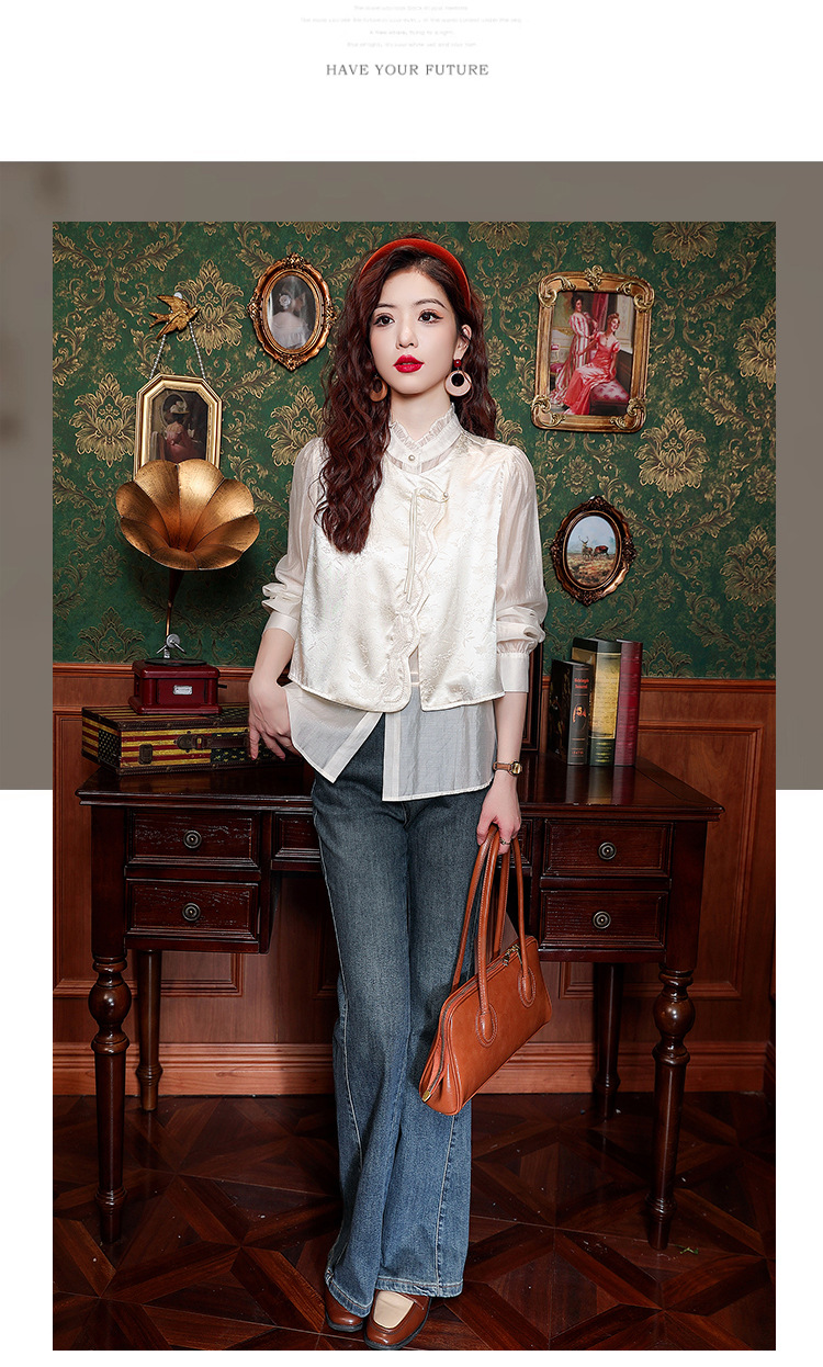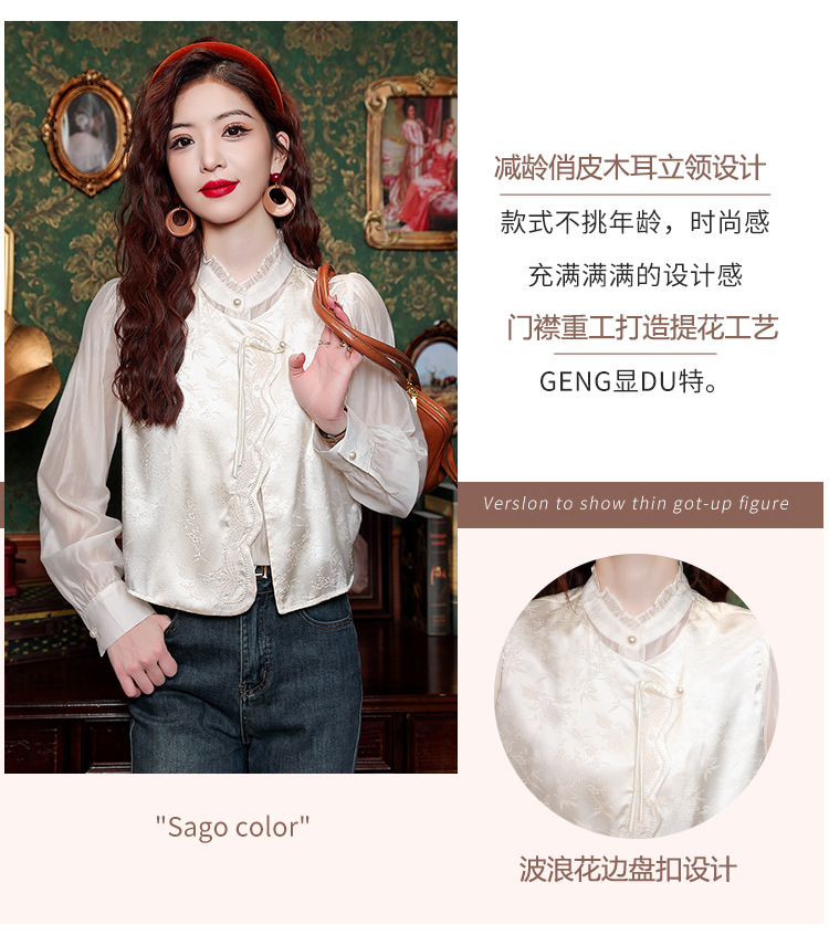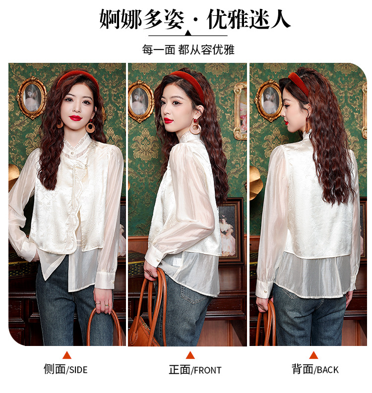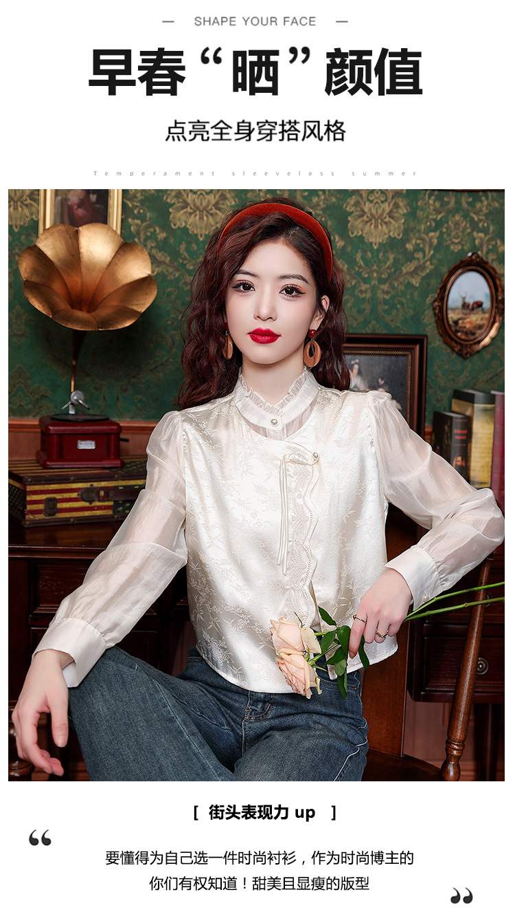 진짜 샷! 2025 봄 새로운 올 매치 달콤한 연꽃 잎 칼라 긴 소매 셔츠 소매 쉬폰 느슨한 유형