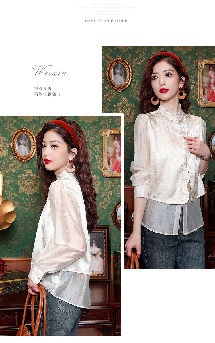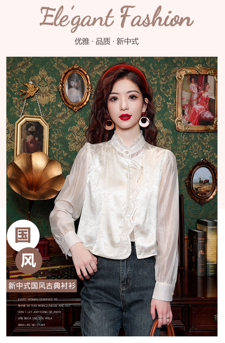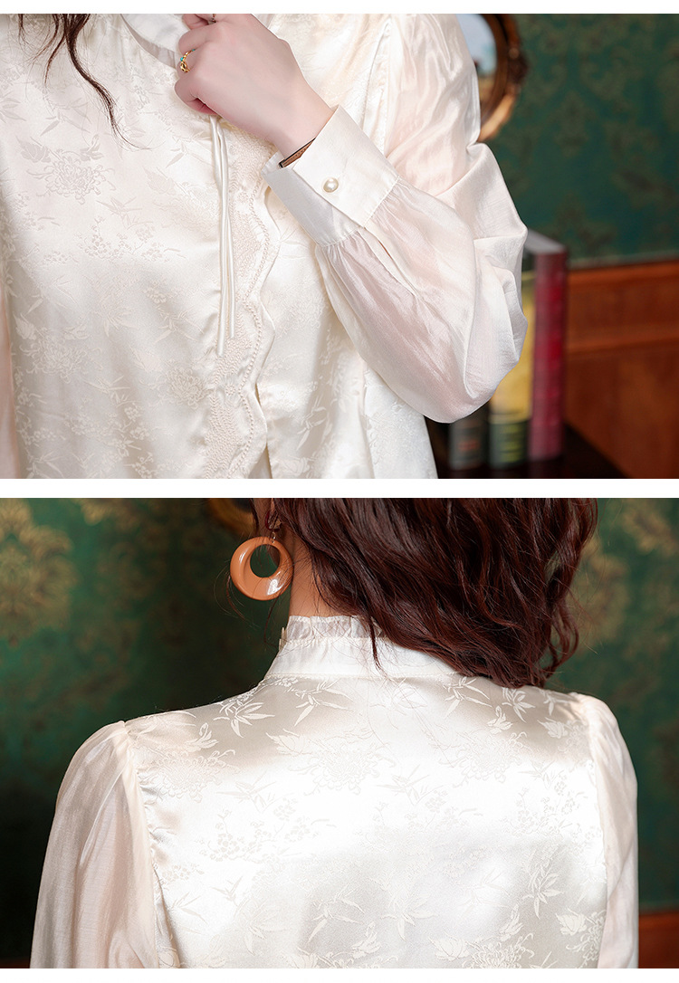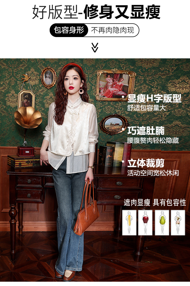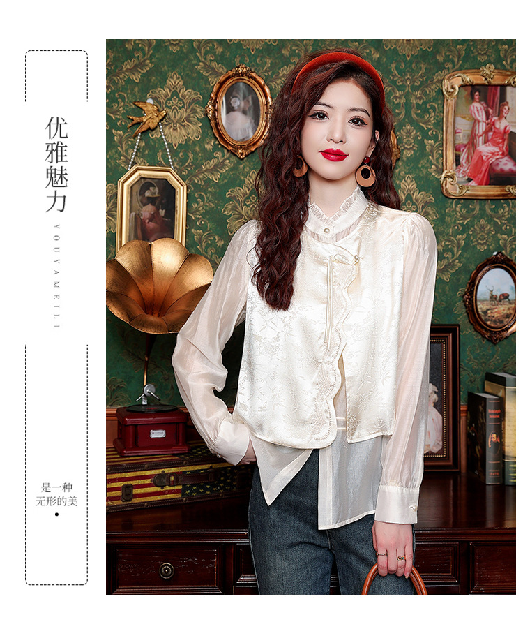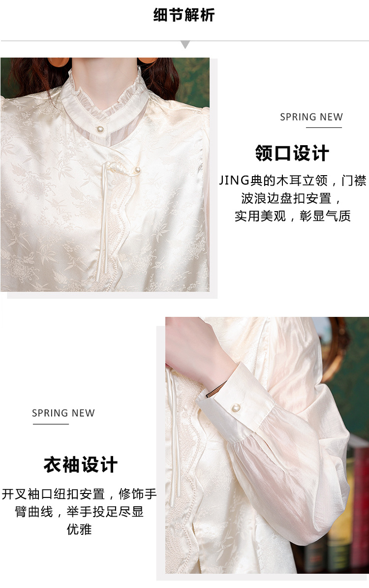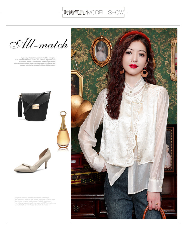 진짜 샷! 2025 봄 새로운 올 매치 달콤한 연꽃 잎 칼라 긴 소매 셔츠 소매 쉬폰 느슨한 유형