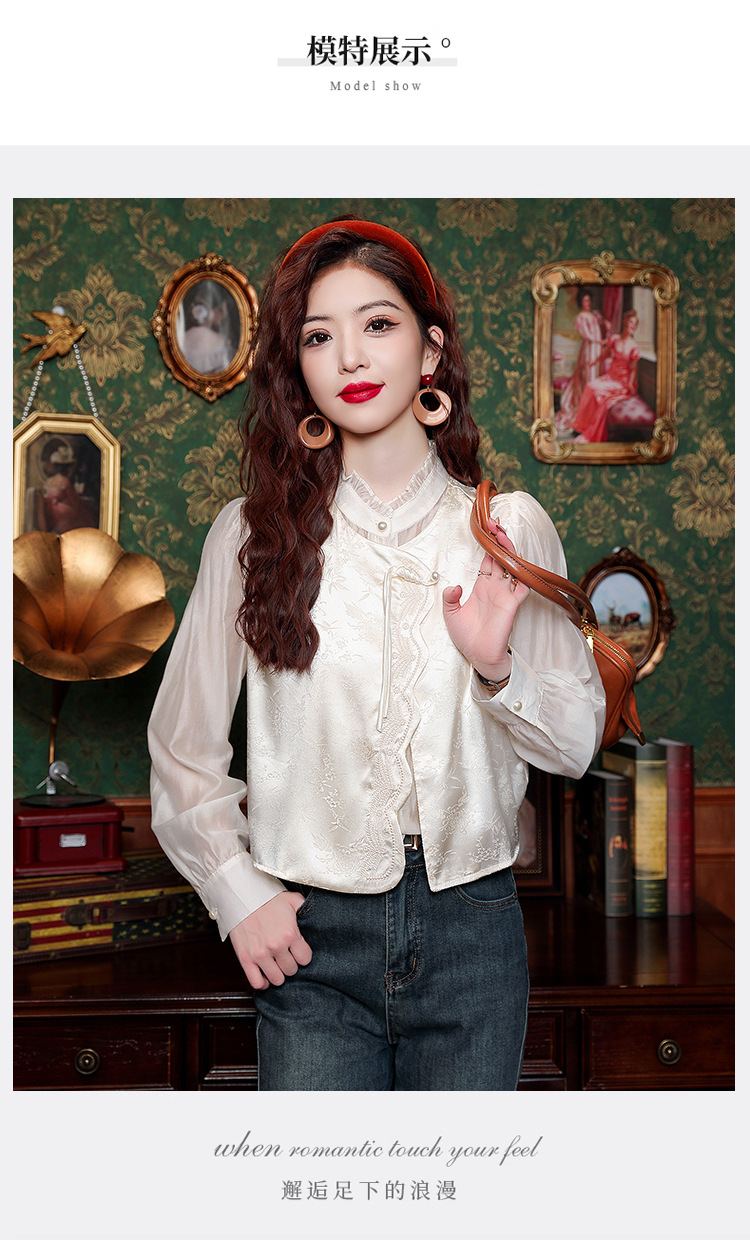 진짜 샷! 2025 봄 새로운 올 매치 달콤한 연꽃 잎 칼라 긴 소매 셔츠 소매 쉬폰 느슨한 유형스토어 가기
