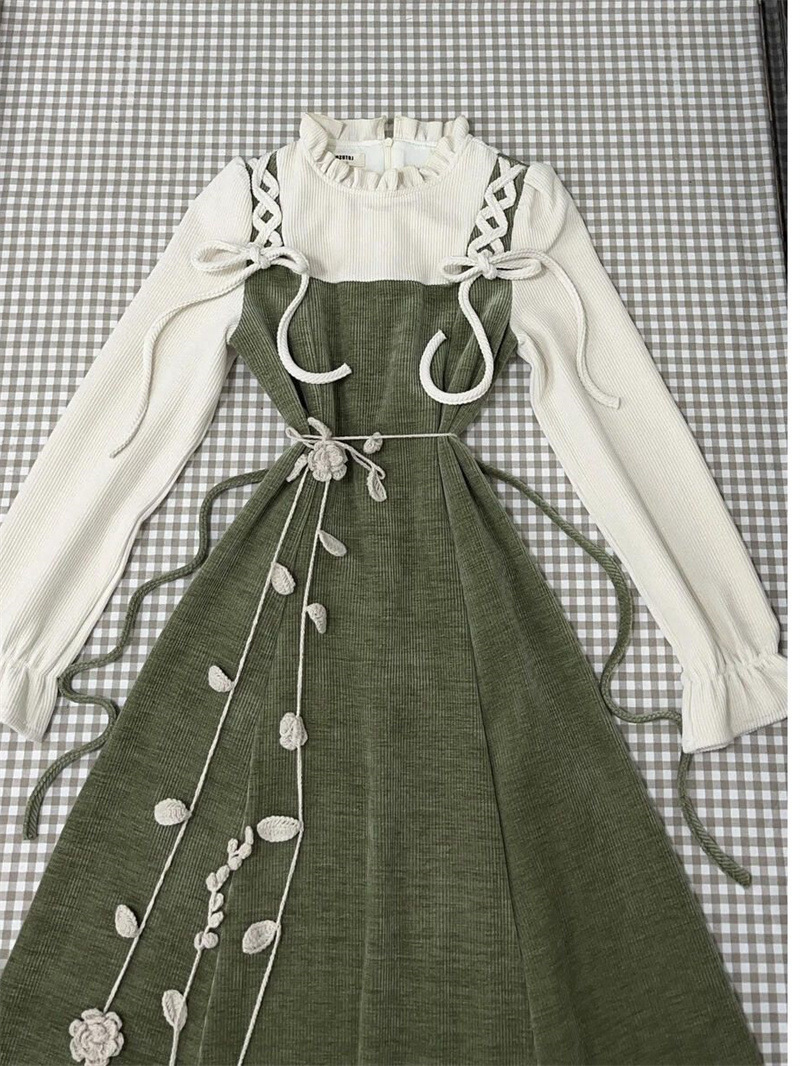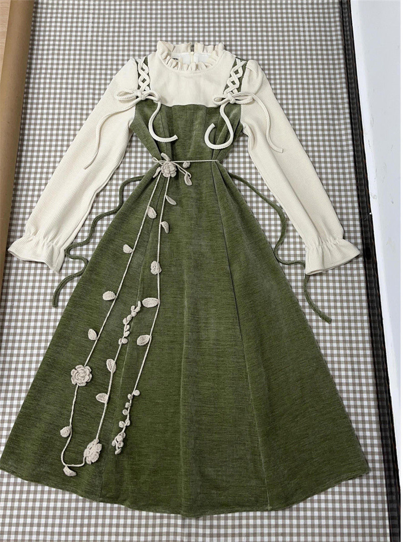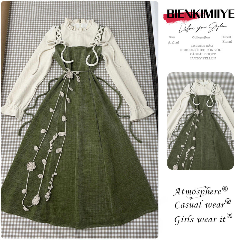 프랑스 달콤한 원피스 여성의 봄 새로운 타이트 허리 슬리밍 그린 오버 더 무릎 중간 길이 스커트스토어 가기