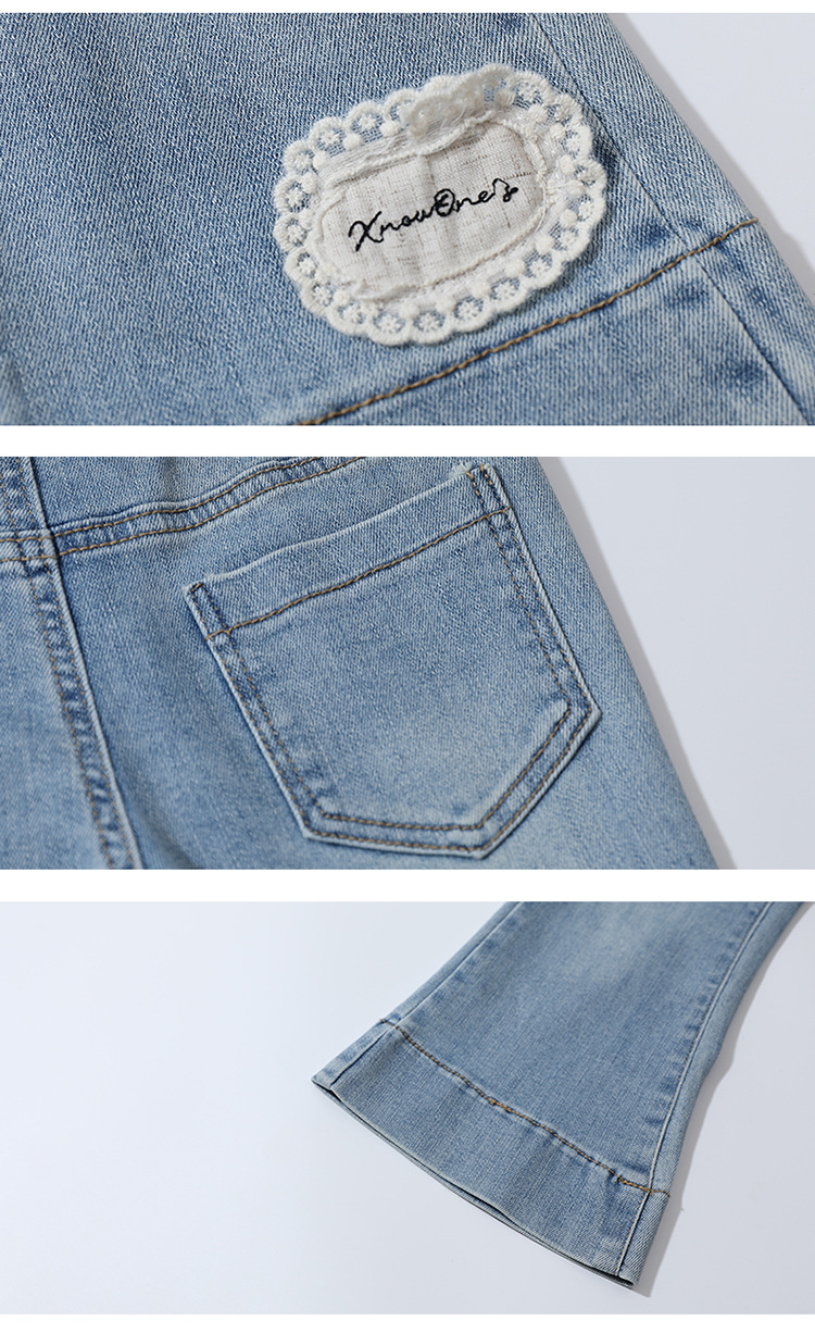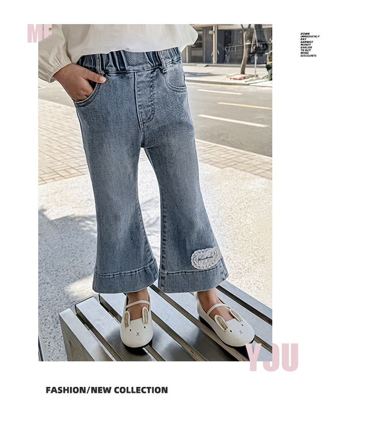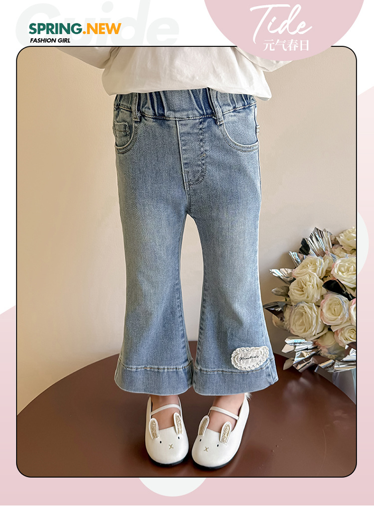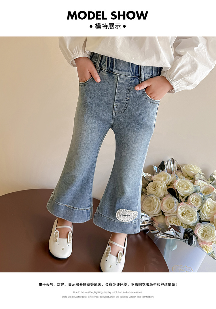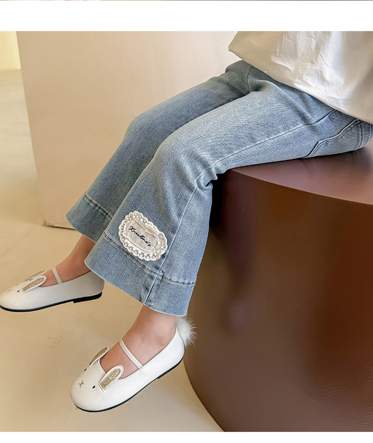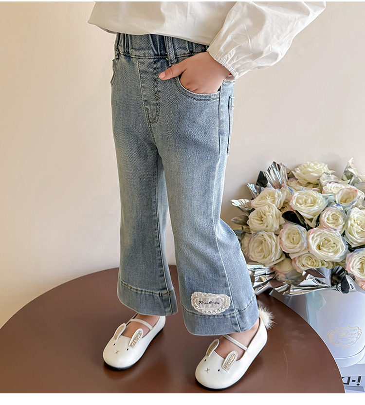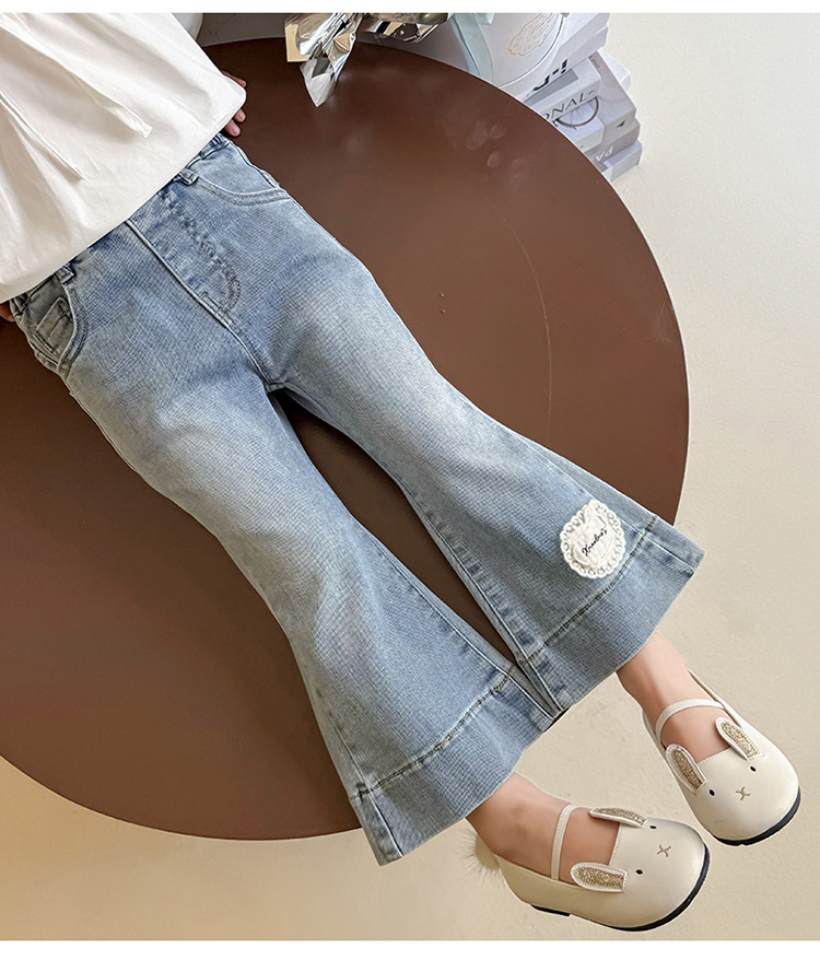 소녀 레이스 라벨링 데님 꽃 무늬 바지 2025 년 봄과 가을 어린 소녀를위한 새로운 패션 바지스토어 가기