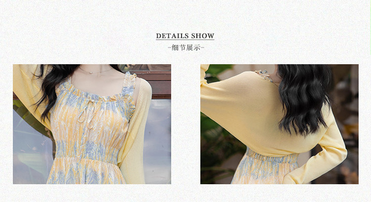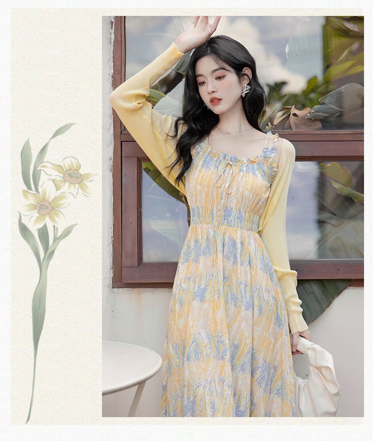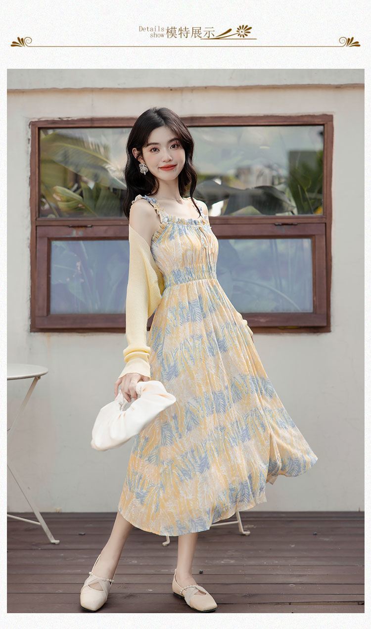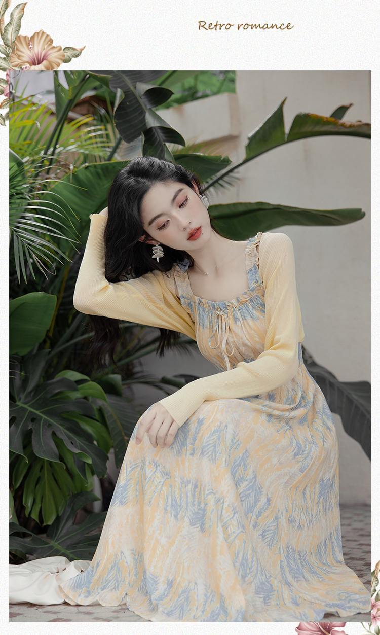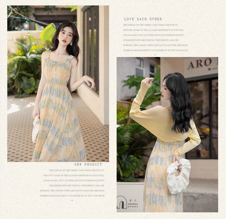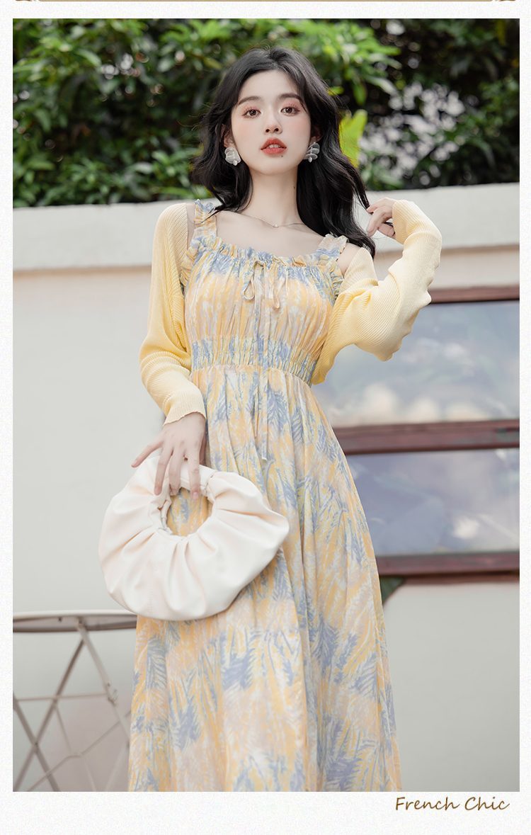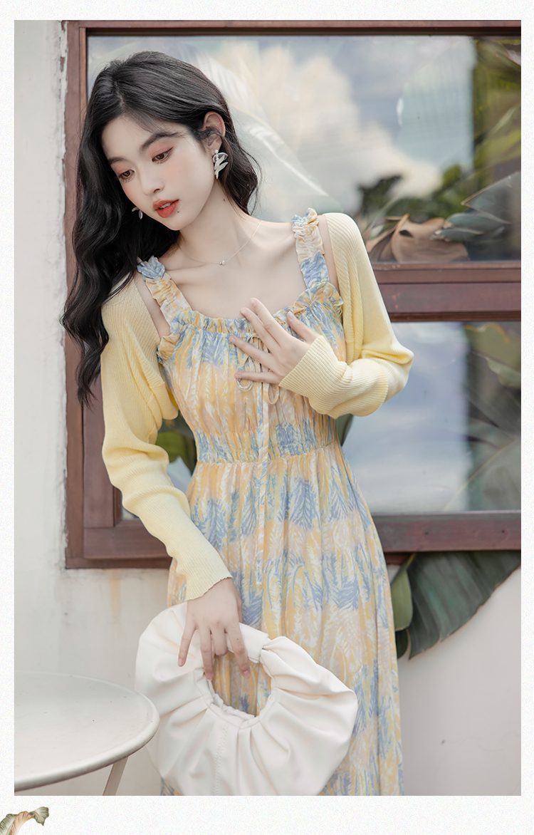 봄과 가을 착용 세트 봄과 여름 새로운 프랑스 스타일 우드 이어 슬링 원피스 외부 블라우스 2 피스 꽃 원피스