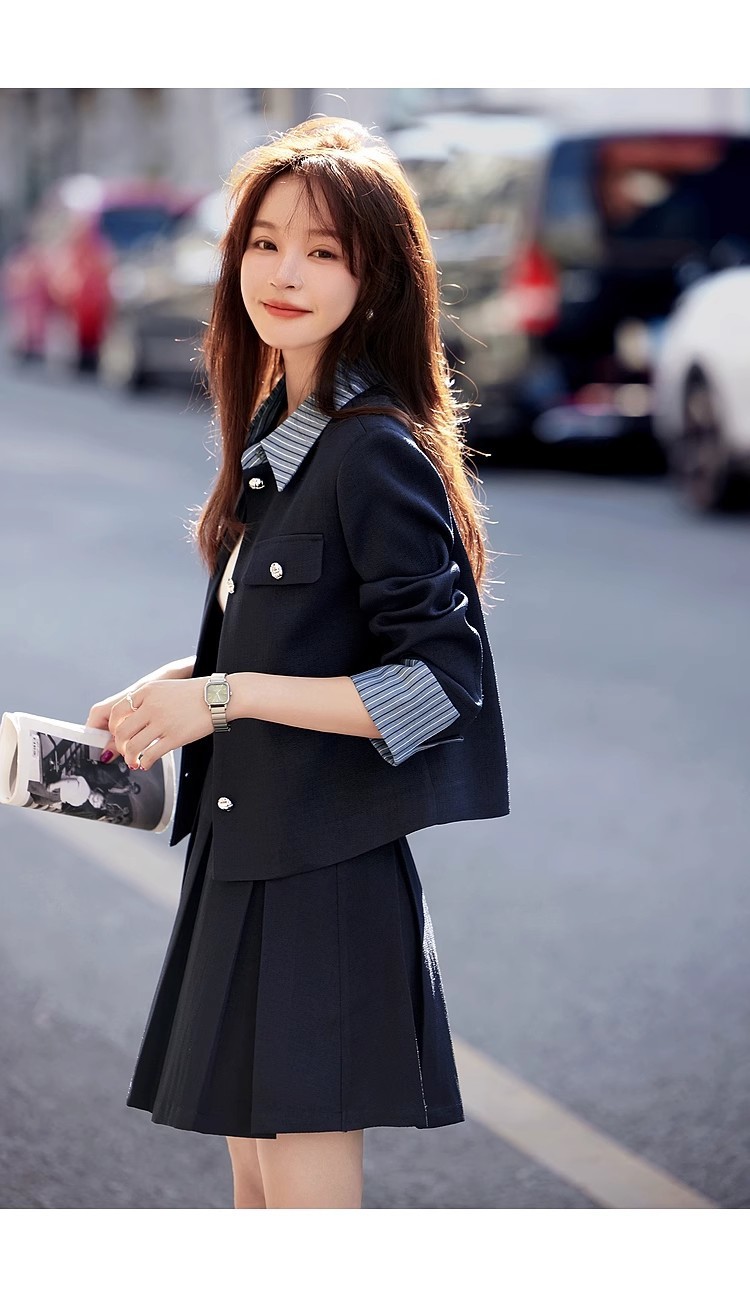 패셔너블한 샤오샹 스타일 투피스 세트 2024 봄 신상 나이를 줄여주는 셔츠 칼라 플리츠 스커트 세트 여성 패션스토어 가기