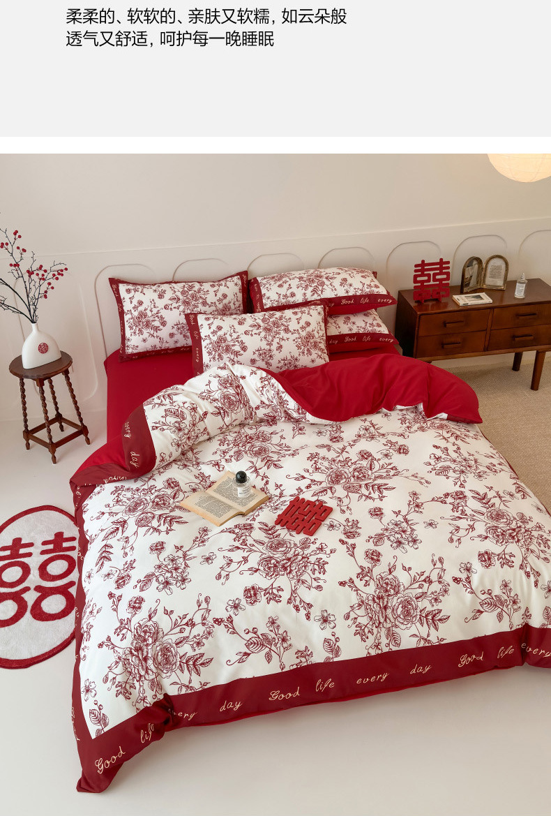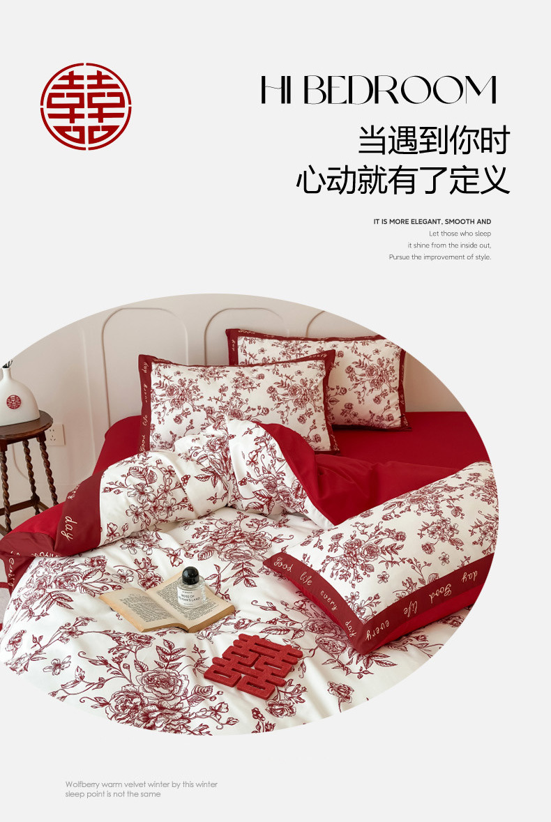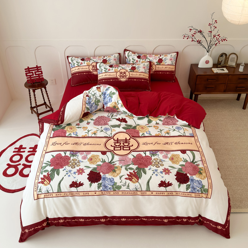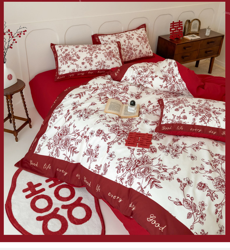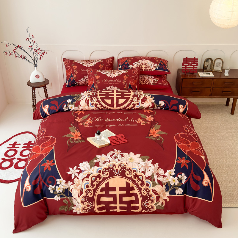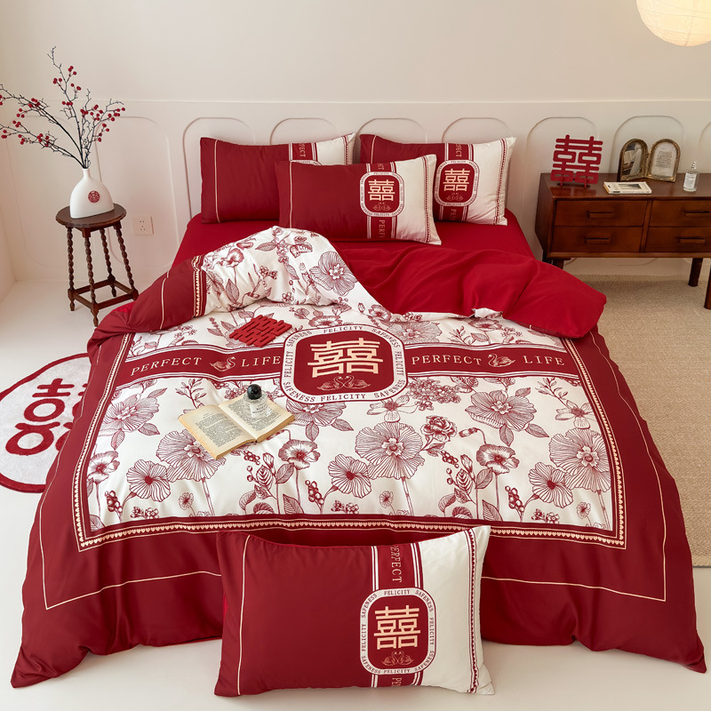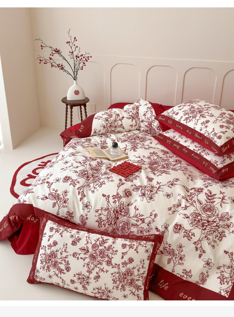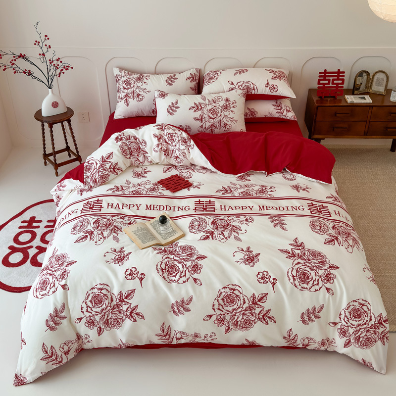 간단한 결혼식 현대 결혼식 4 조각 빨간 침대 시트 인쇄 된 퀼트 커버 웨딩 코튼 침구 결혼식 동반스토어 가기