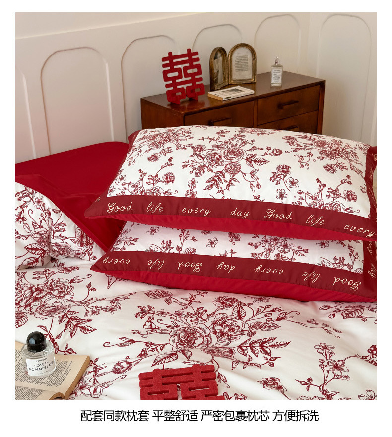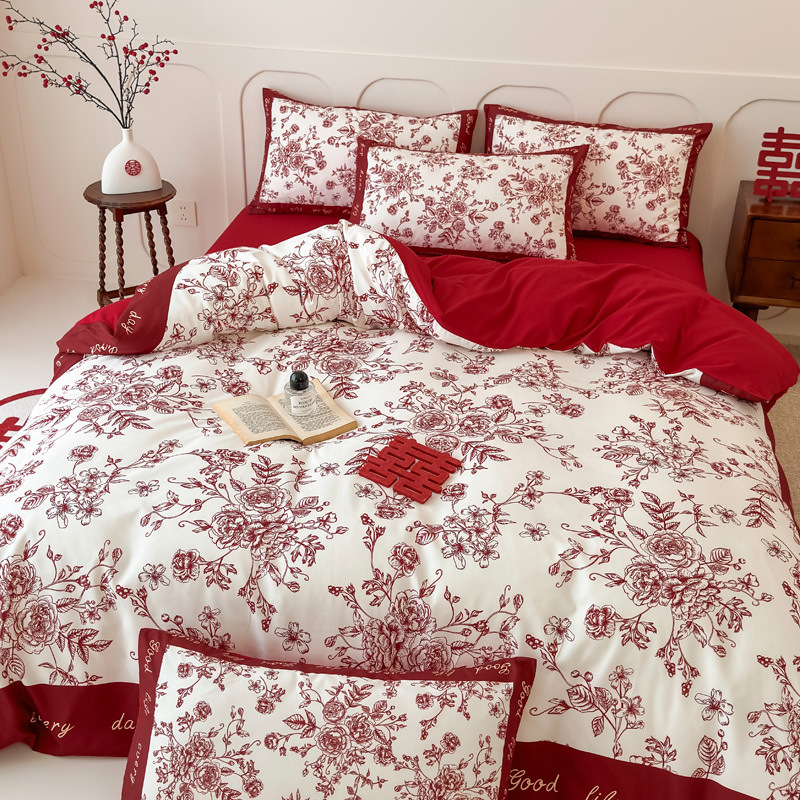 간단한 결혼식 현대 결혼식 4 조각 빨간 침대 시트 인쇄 된 퀼트 커버 웨딩 코튼 침구 결혼식 동반