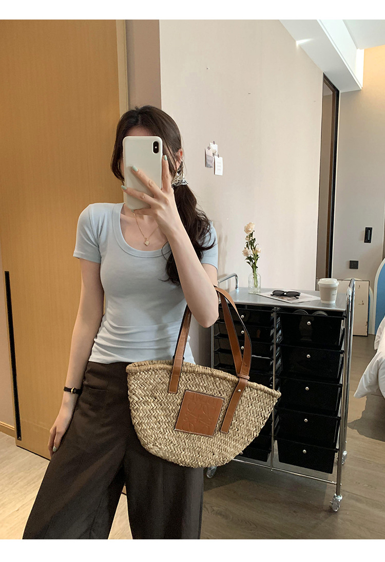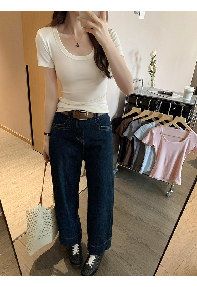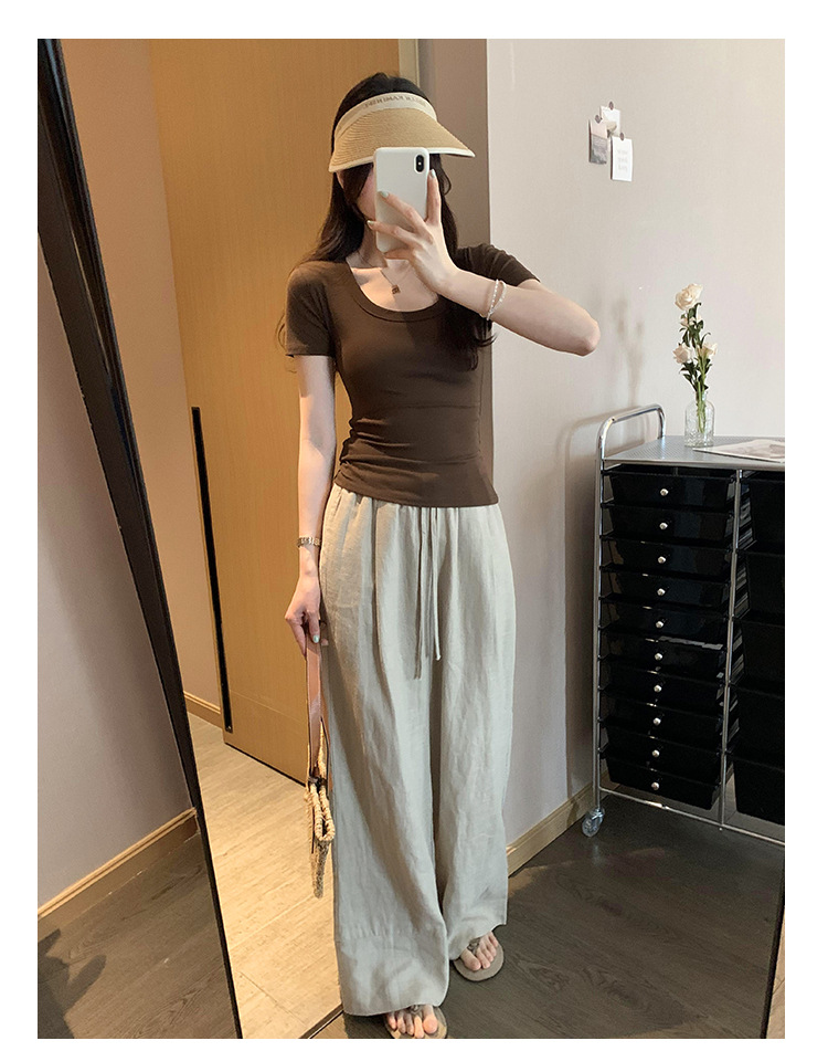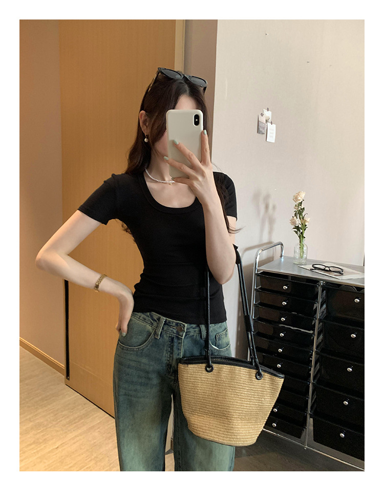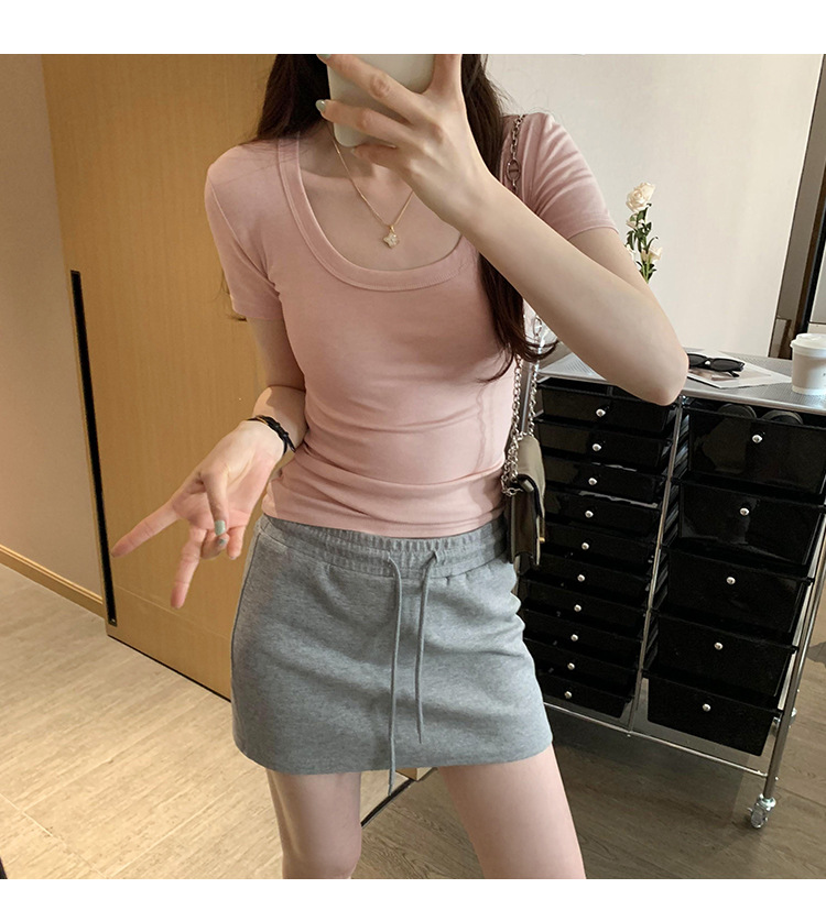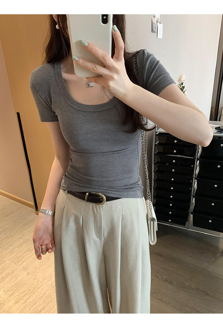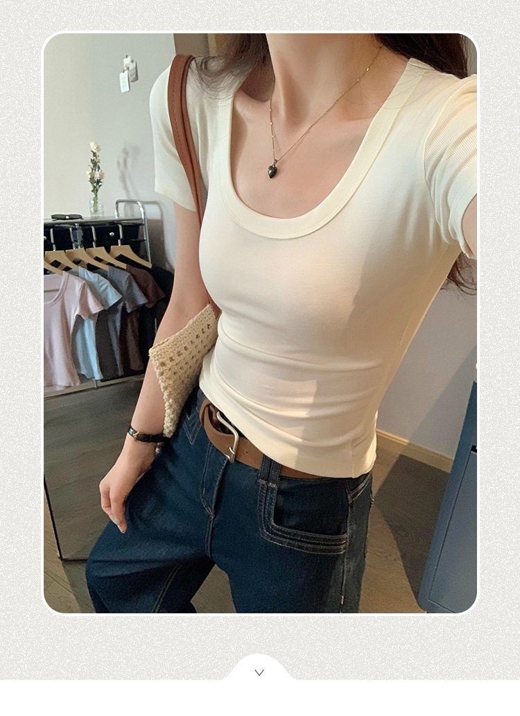 솔리드 컬러 어깨 슬림 핏 U-넥 내면베이스 셔츠 반팔 티셔츠 여성용 2025 여름 여성복 주름 디자인 탑스토어 가기