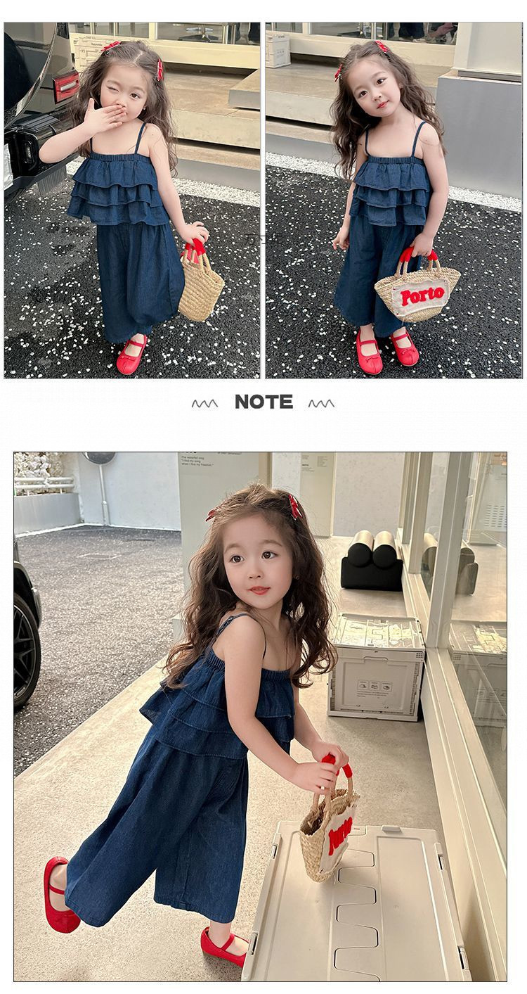 2025 여름 새 소녀 세트 작은 소녀 슬링 데님 넓은 다리 바지 아기 짧은 소매 최고 2 조각 세트