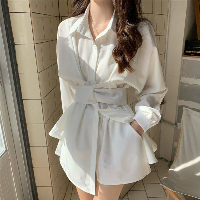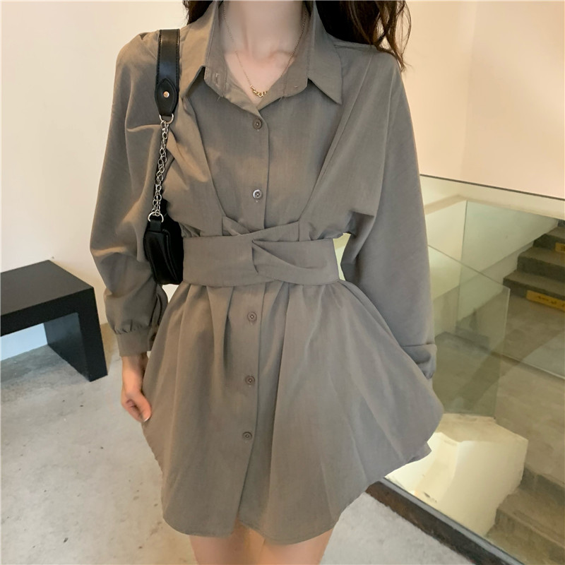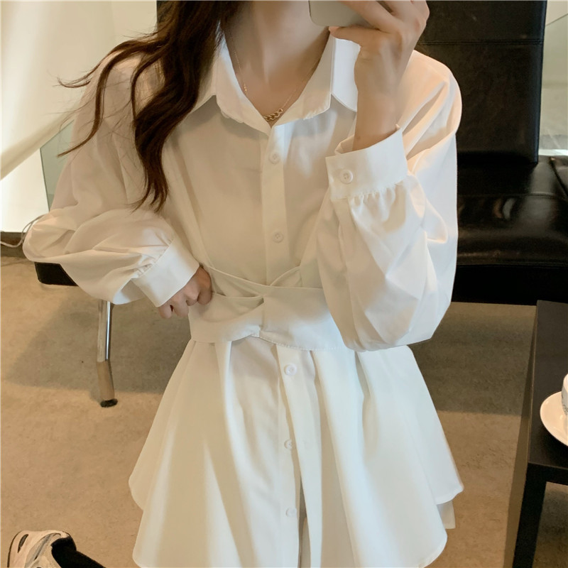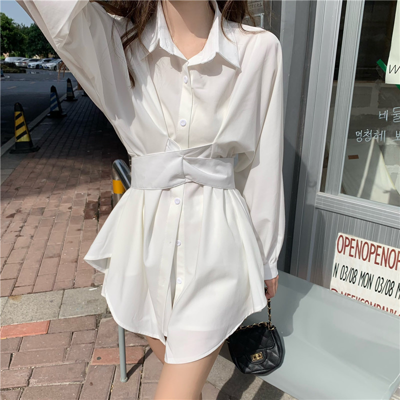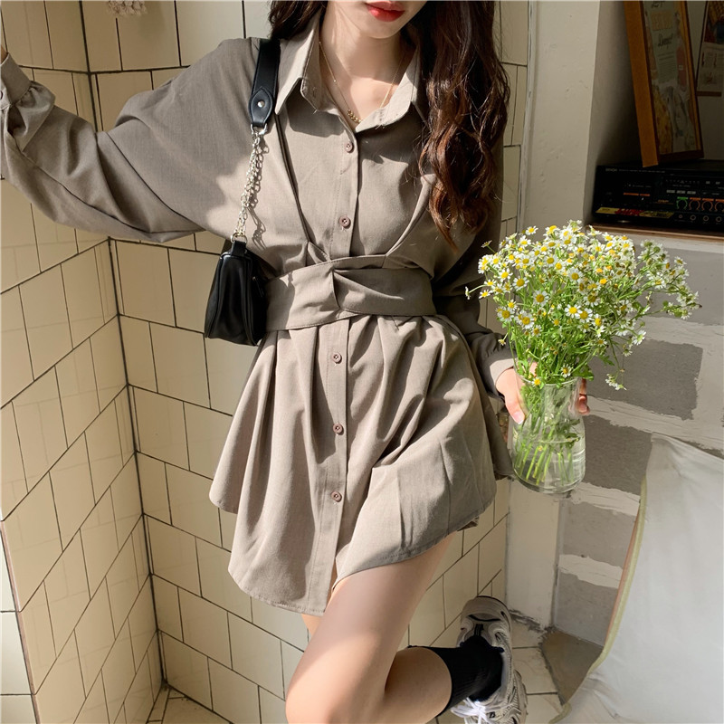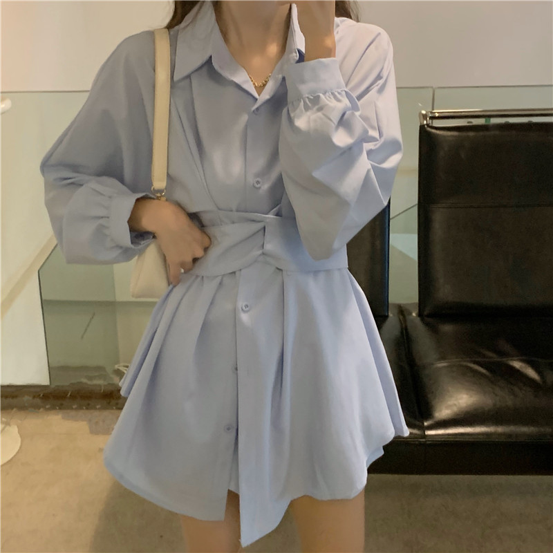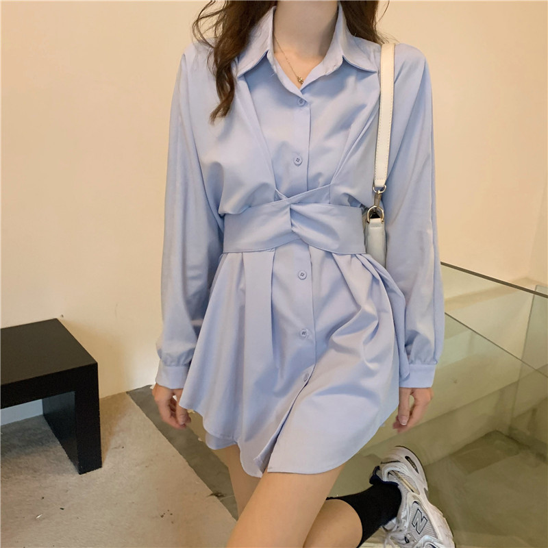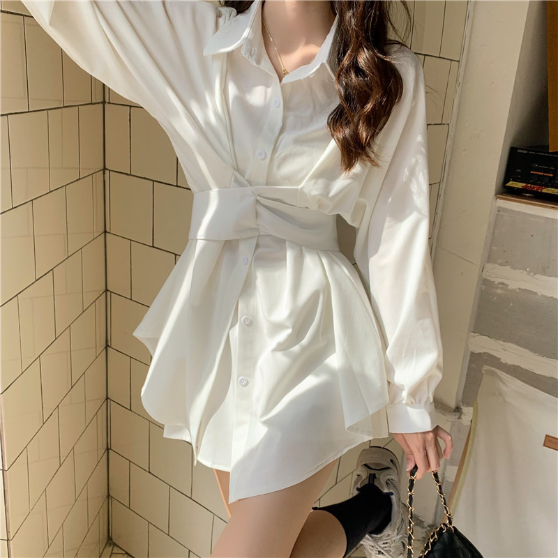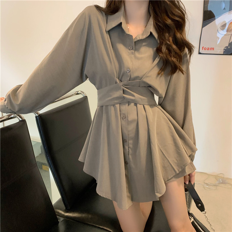꽉 허리 슬리밍 긴 소매 셔츠 원피스 여성의 봄과 가을 새로운 프랑스 기질 짧은 불규칙한 긴 셔츠스토어 가기