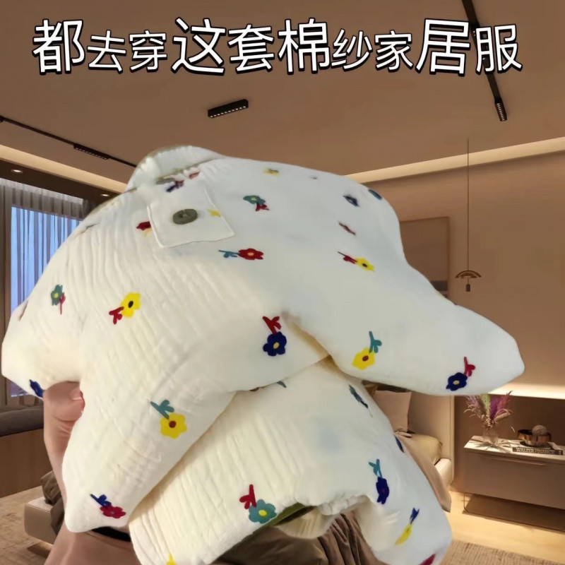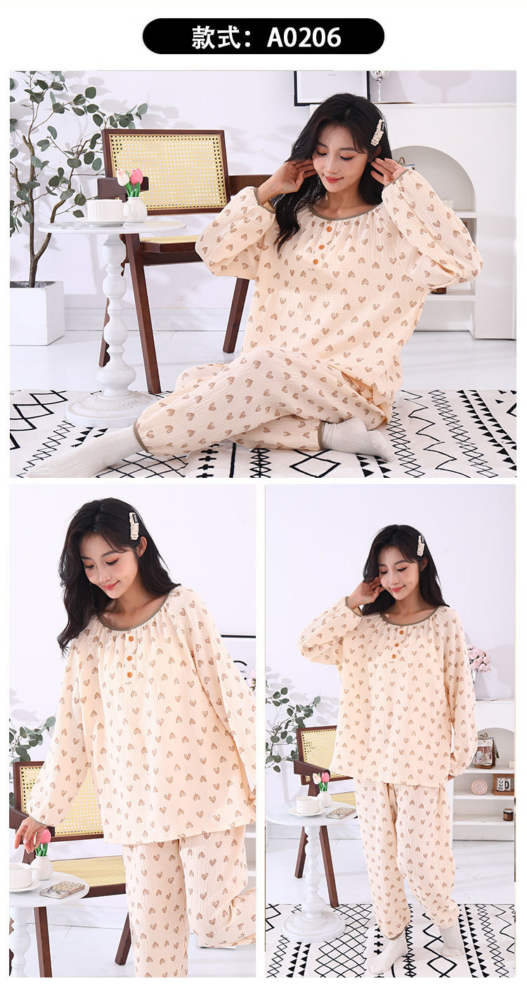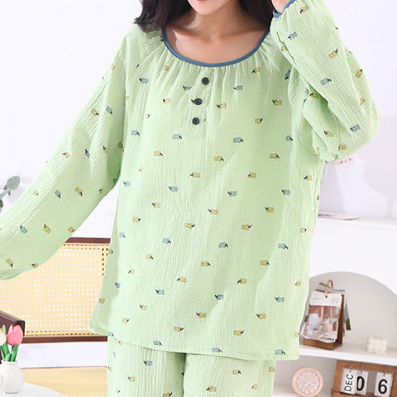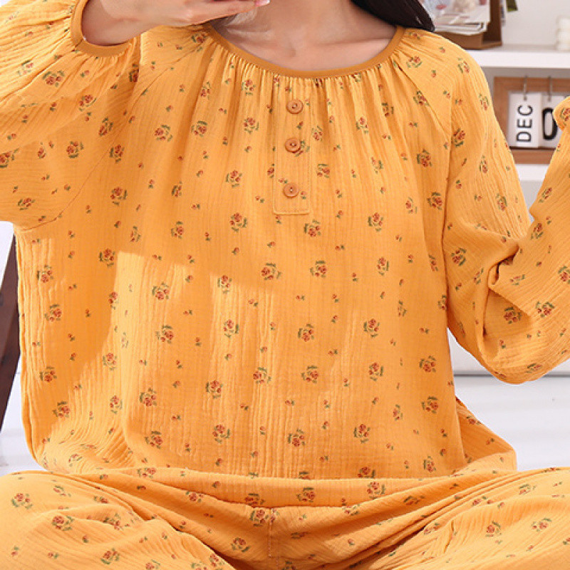 A6C1OO % 면 봄과 가을 느슨한 긴 소매 잠옷 여성용 얇은 면 원사 더블 거즈 코튼 리넨 홈 의류스토어 가기