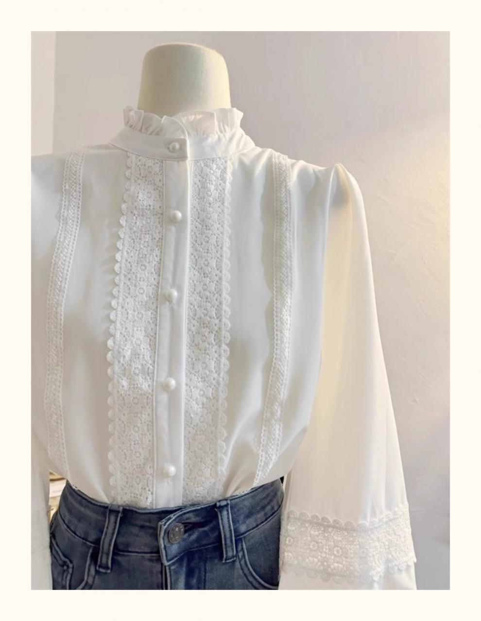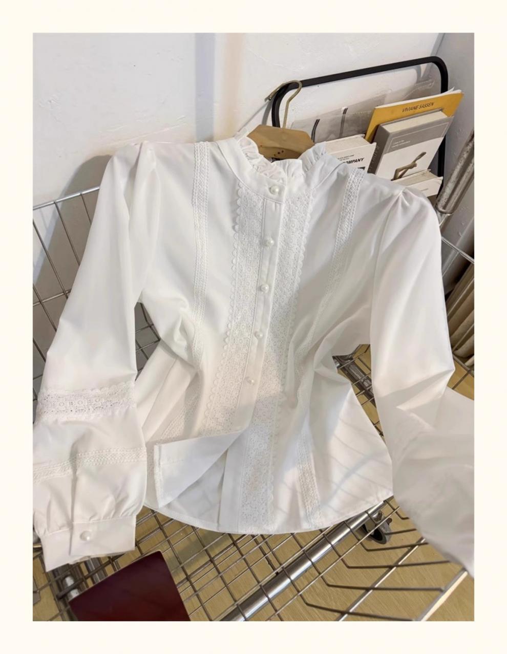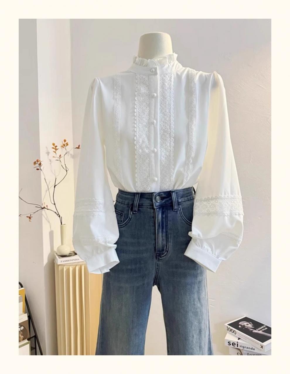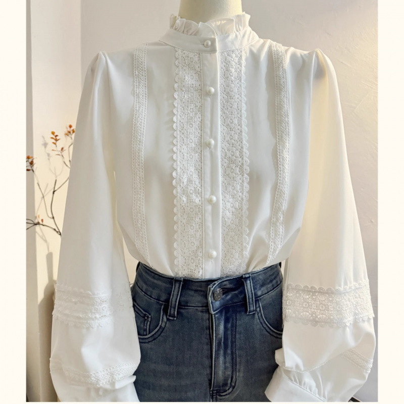 A6C 레이스 바느질 화이트 곰팡이 칼라 셔츠 여성의 2024 가을 서양식 랜턴 긴팔 셔츠스토어 가기
