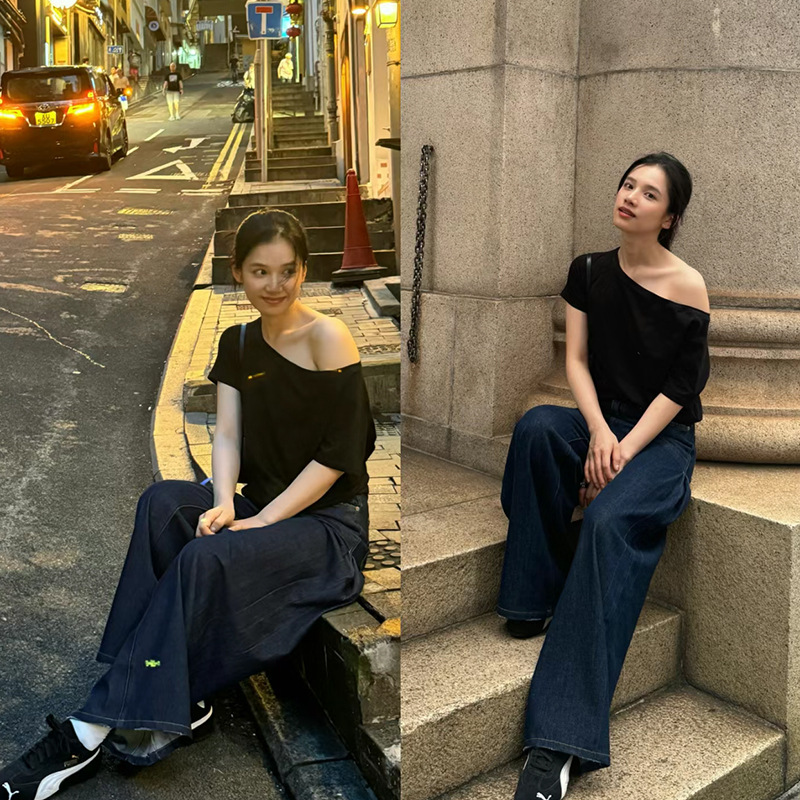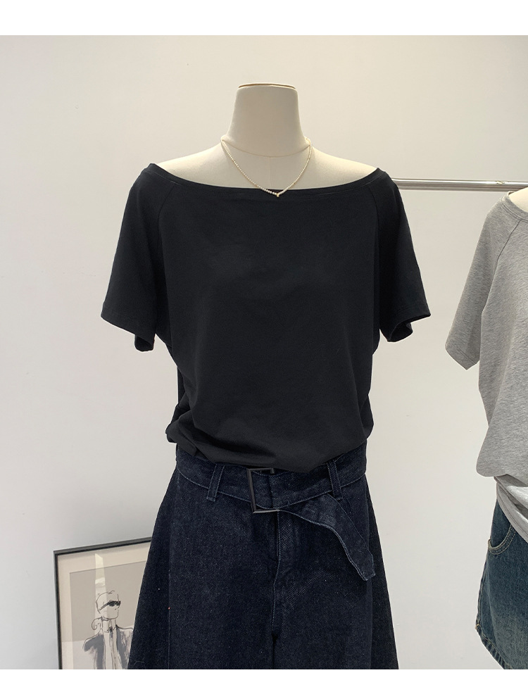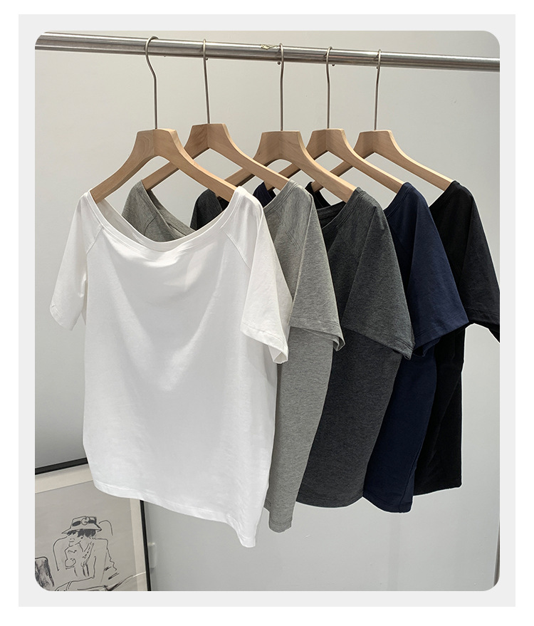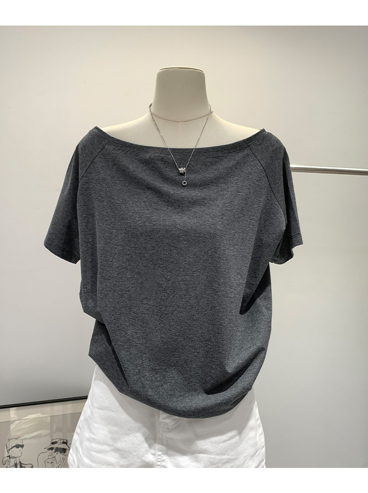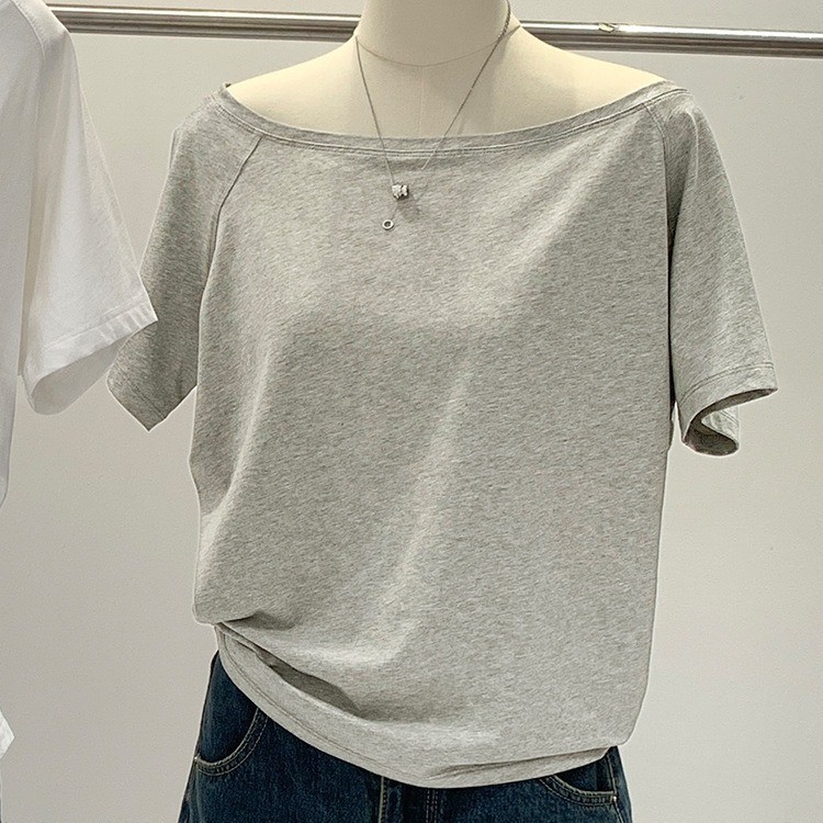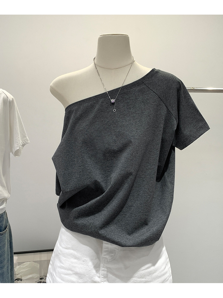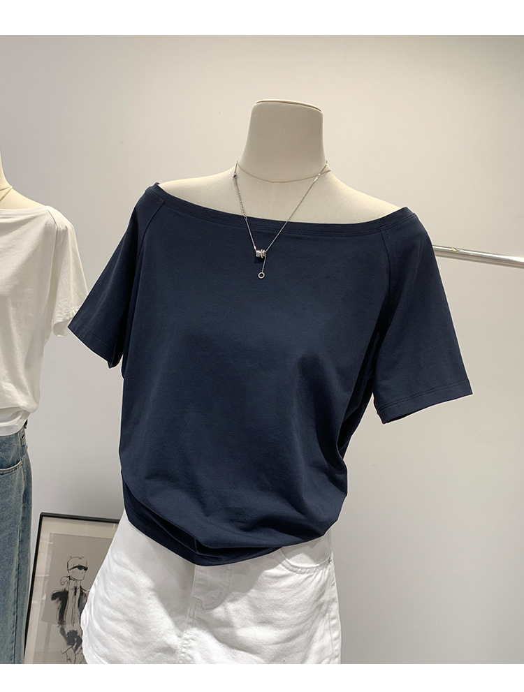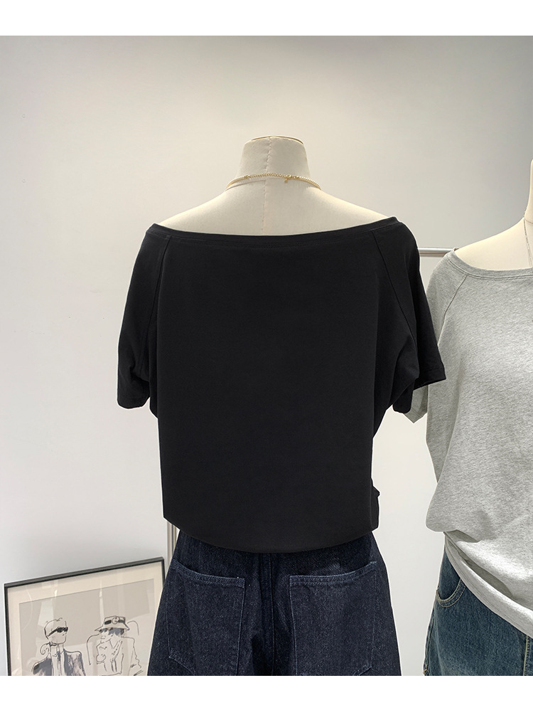 시 라임 뉴 스타일 장징이 한 캐릭터 날씬한 어깨 느슨한 게으른 반팔 티셔츠 여성 디자인 숄더 탑