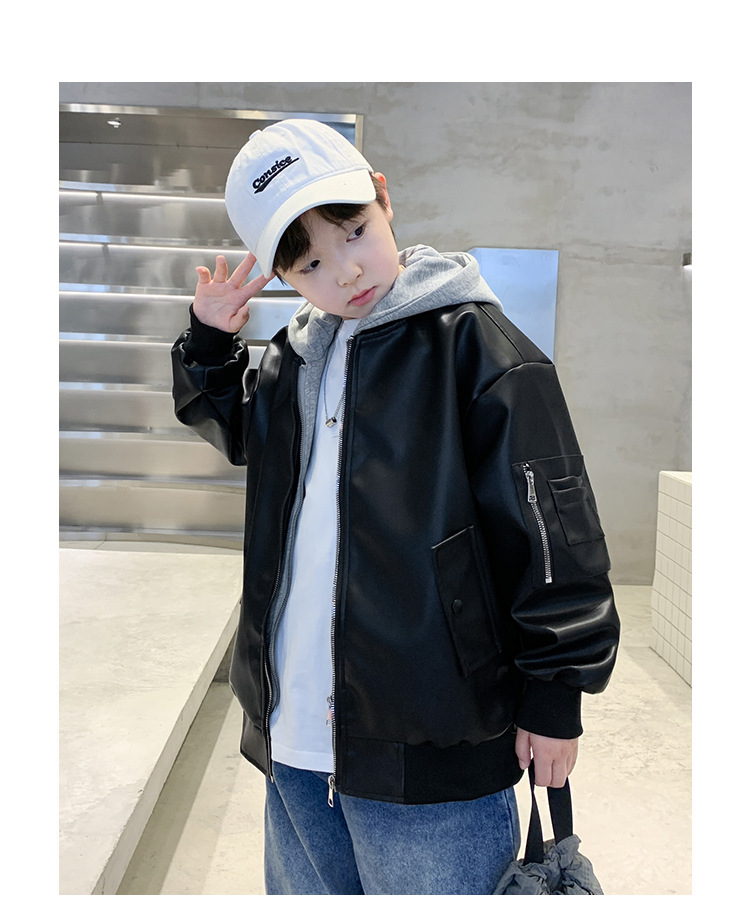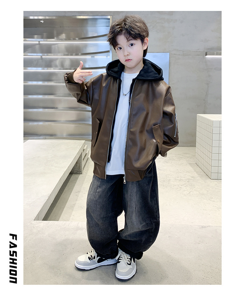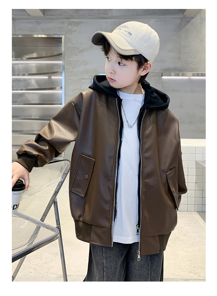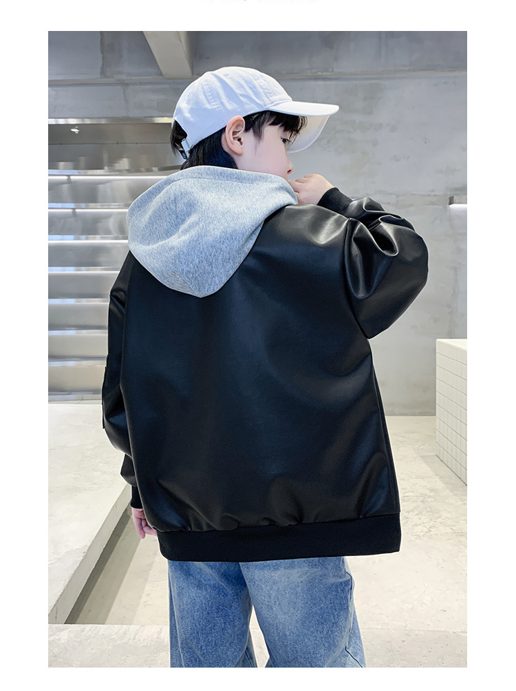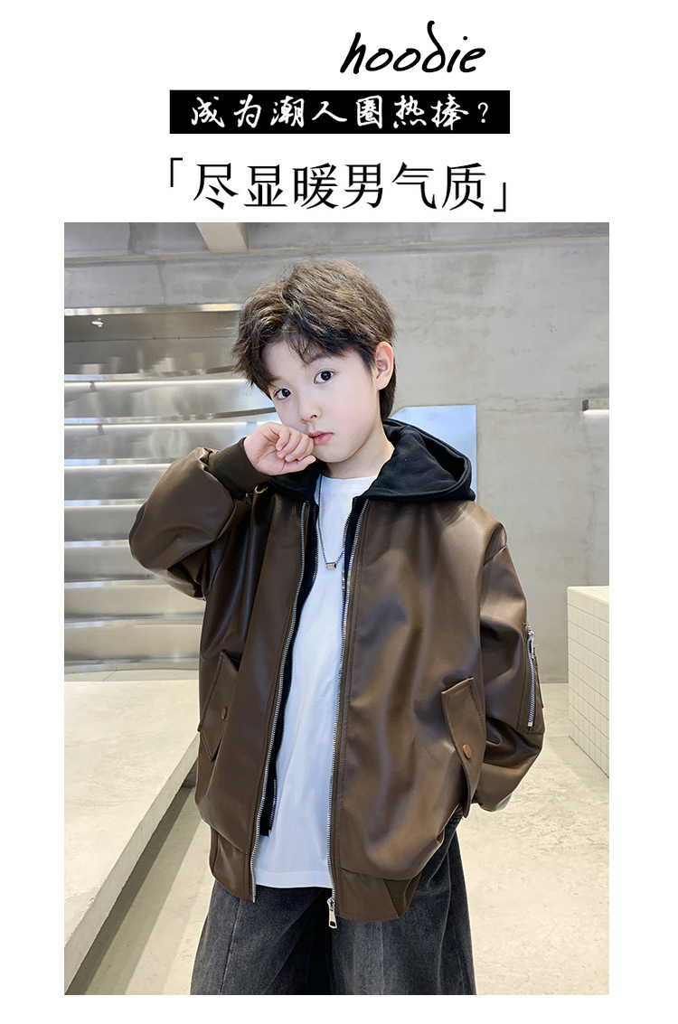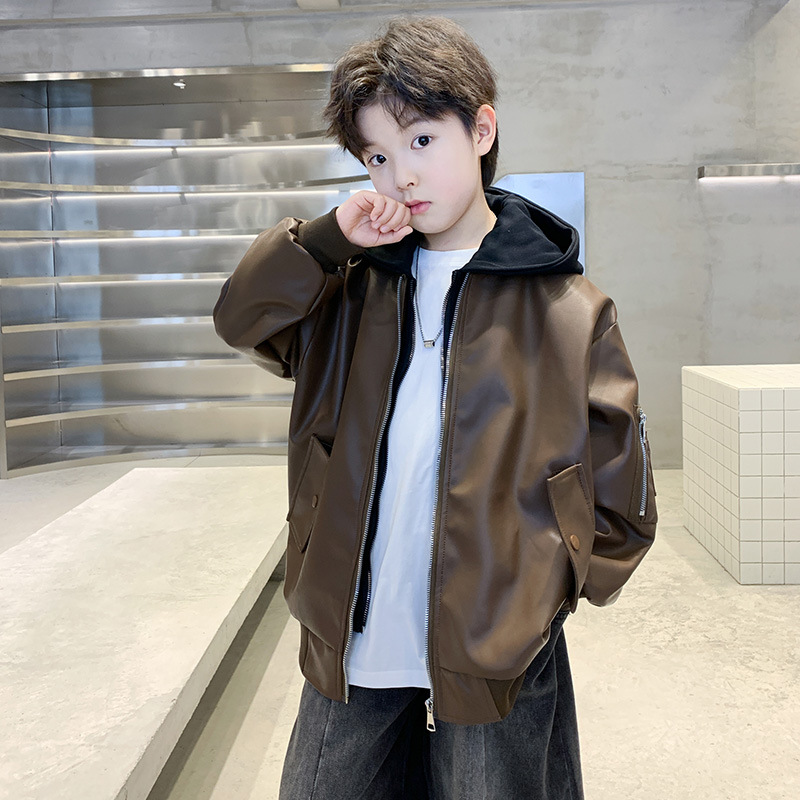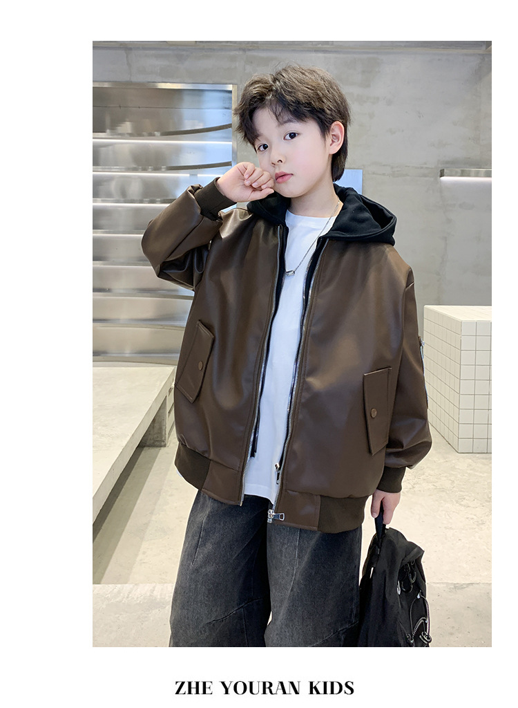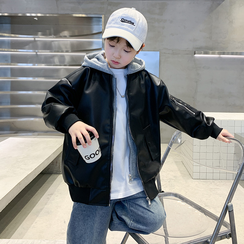 소년의 봄과 가을 가짜 투피스 가죽 코트 2025 새로운 스타일 빅 보이 핸섬 후드가 유행하는 핸섬 트렌디스토어 가기
