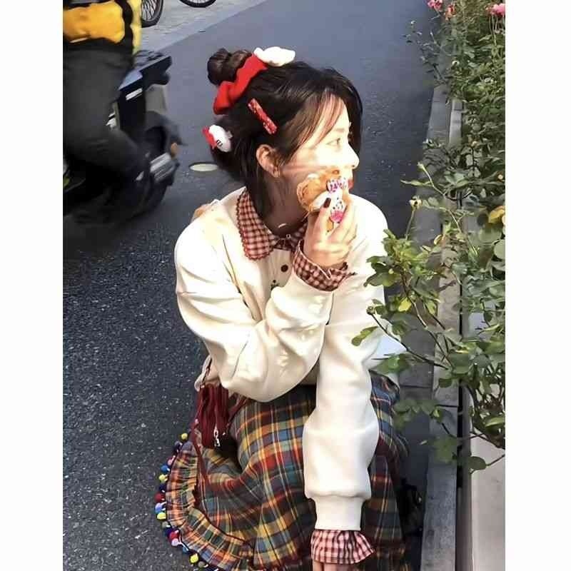 봄 새로운 작은 설탕 콩! 빈티지 홀리데이 센스 다채로운 체크 무늬 스커트