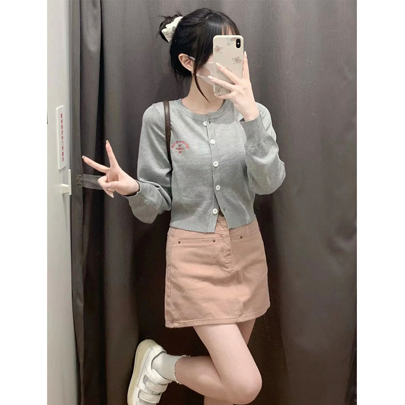 대학 스타일 니트 카디건 코트 여성의 가을 하이 엔드 센스 작은 우아한 회색 긴팔 짧은 치마 투피스 세트스토어 가기