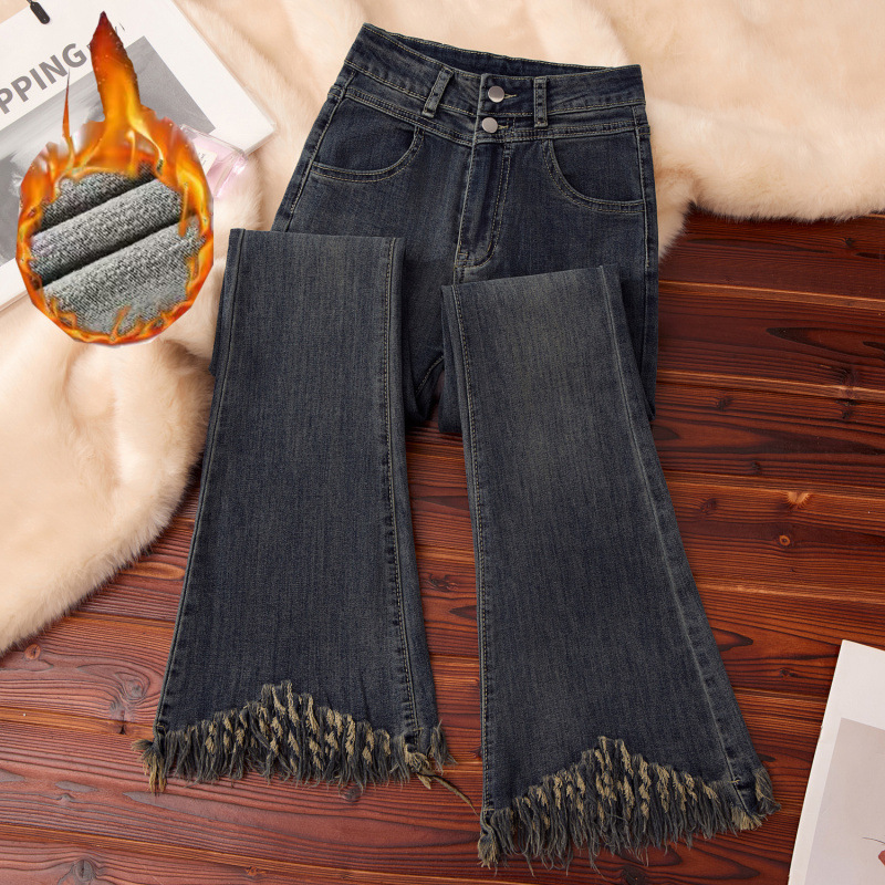 시멘트 회색 얇은 벨벳 마이크로 청바지 여성의 겨울 2025 새로운 하이 웨이스트 슬림 핏 작은 말굽 플레어 팬츠
