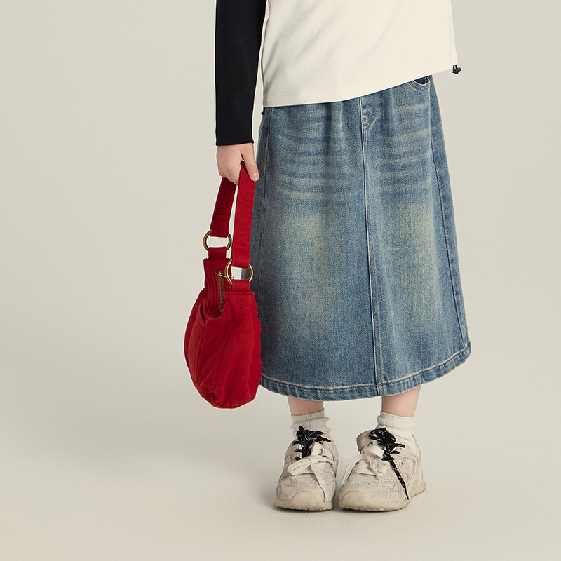 Elmo Beibei 여아 한국 패션 슬릿 데님 스커트 아동용 봄 캐주얼 A 라인 중간 길이 스커트스토어 가기
