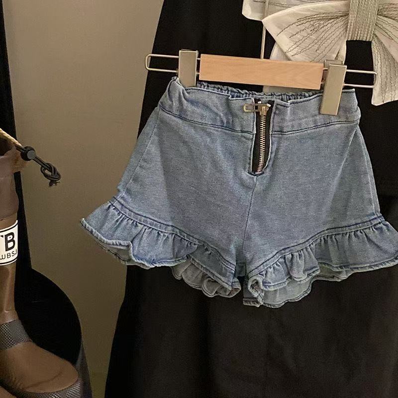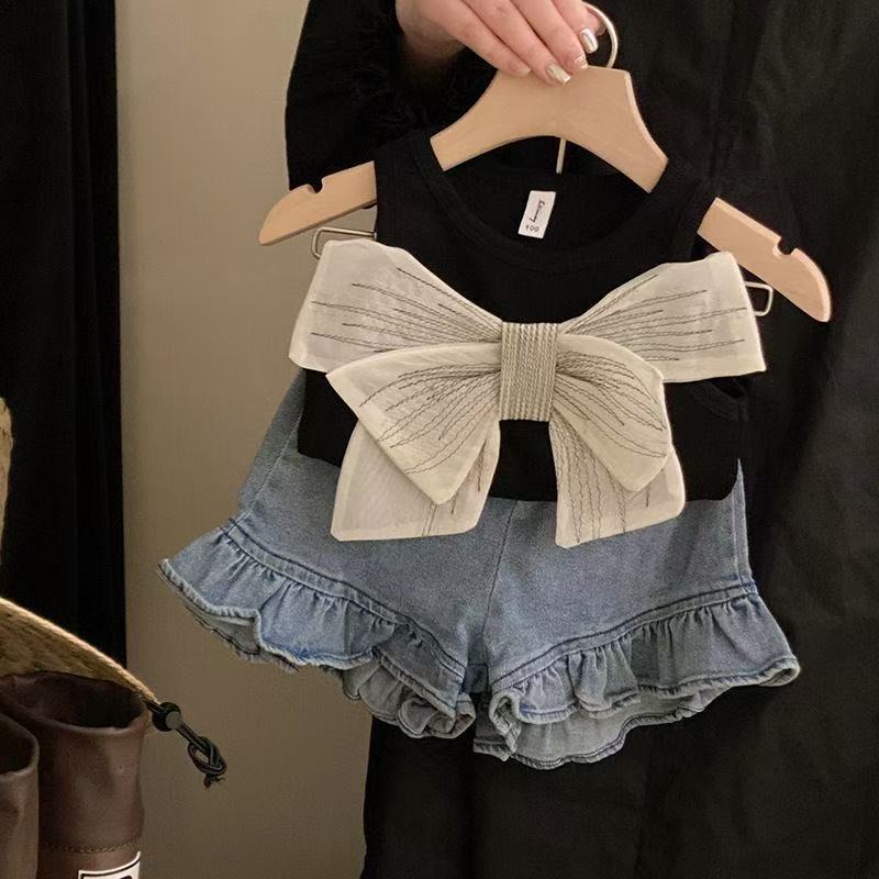 소녀 여름 세트 2025 새로운 도착 소녀 패션 빅 보우 조끼 레이스 데님 반바지 투피스 트렌디 세트스토어 가기