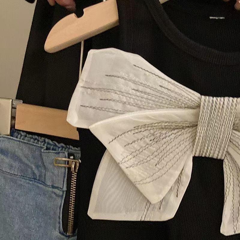• 큰 리본 블랙 조끼 + 레이스 데님 반바지