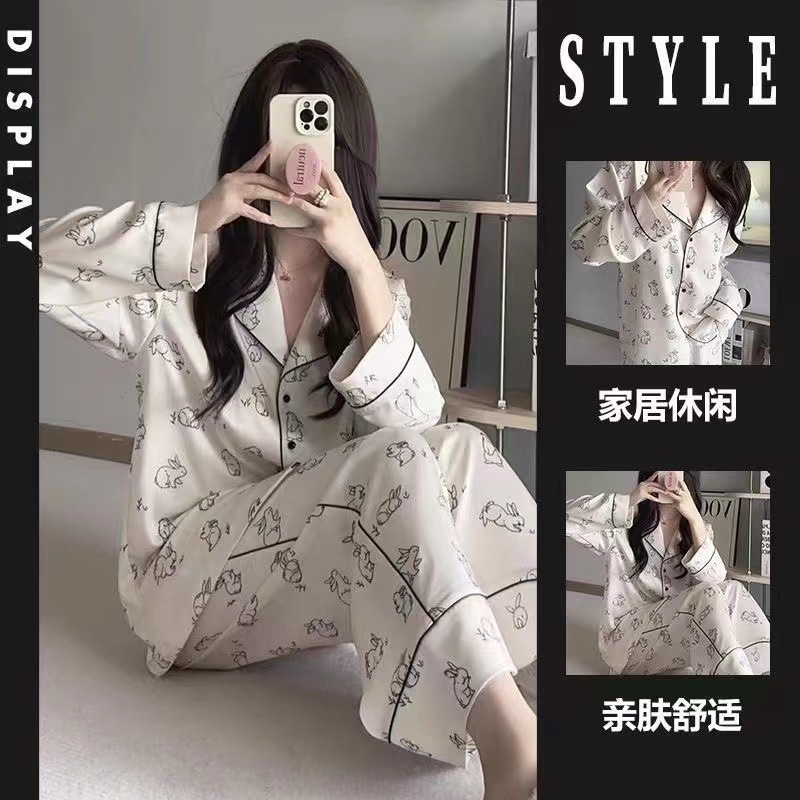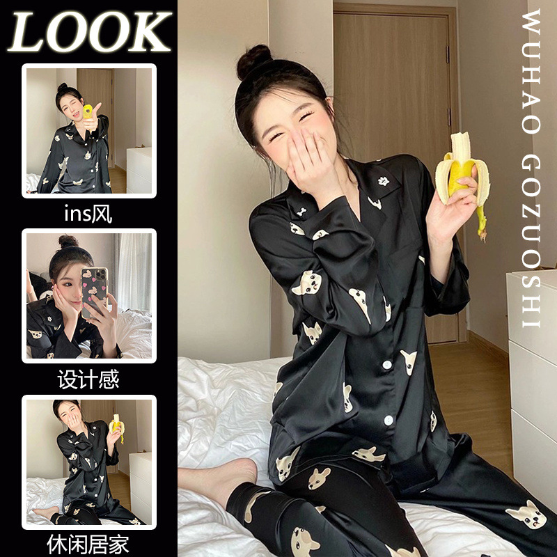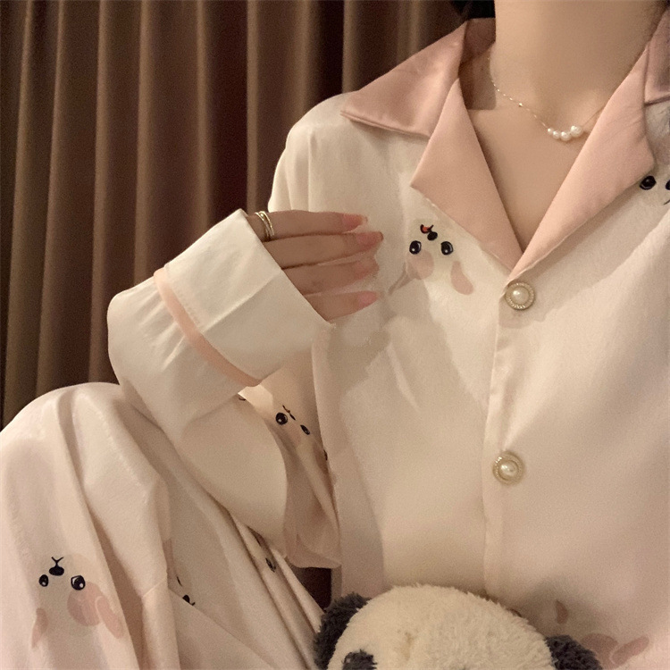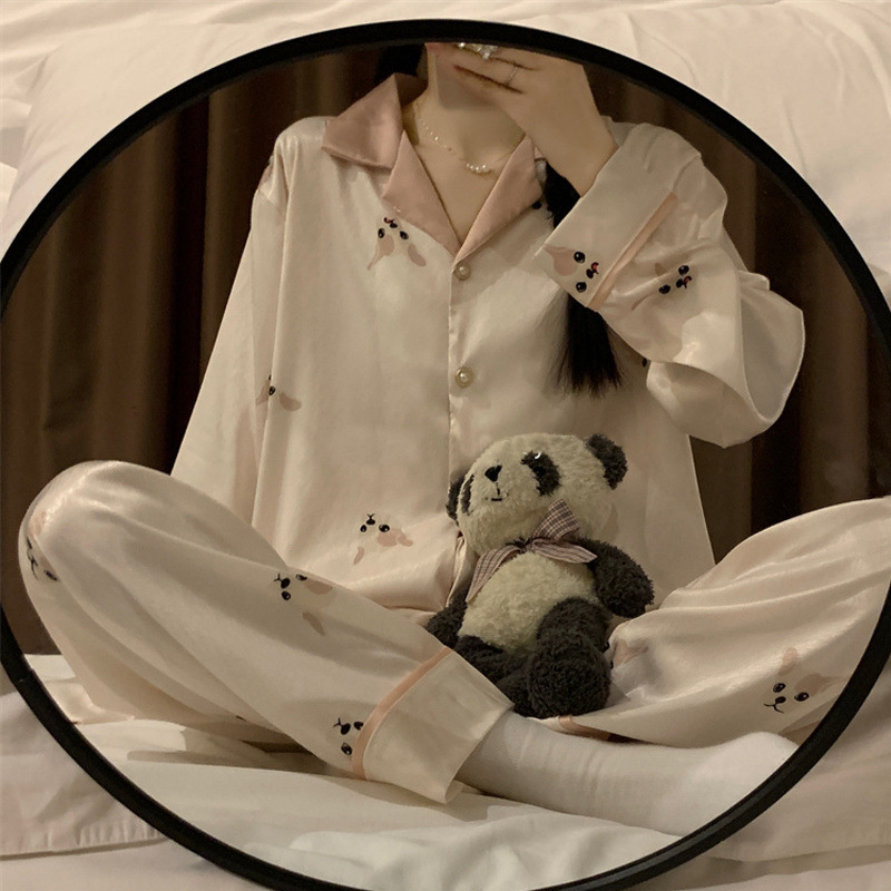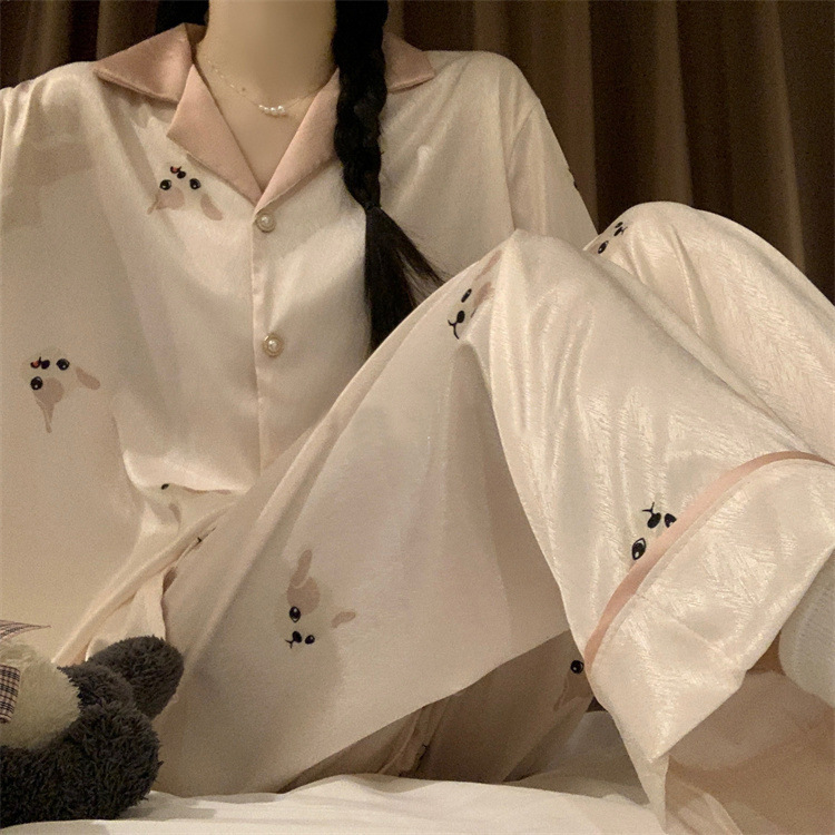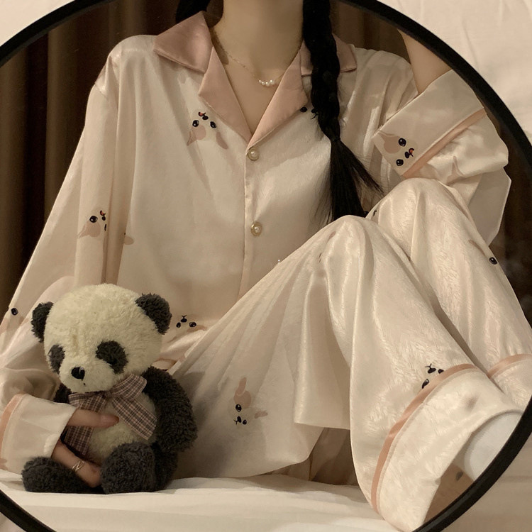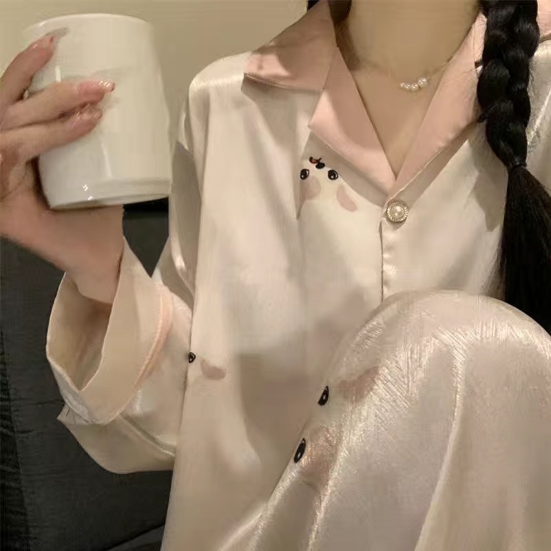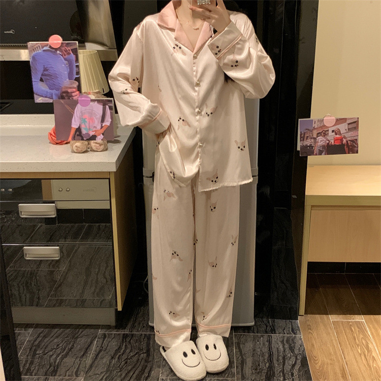 프랑스 고급 아이스 실크 긴 소매 파자마 여성의 봄과 가을 2025 새로운 도착 바지 학생 홈 의류 세트스토어 가기