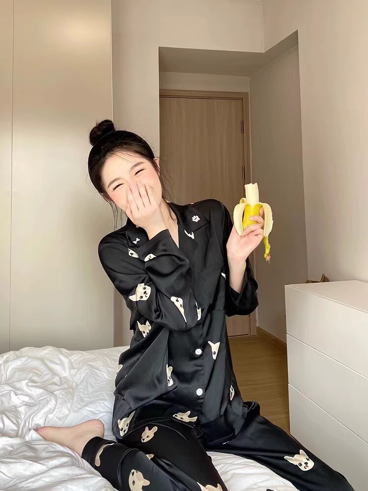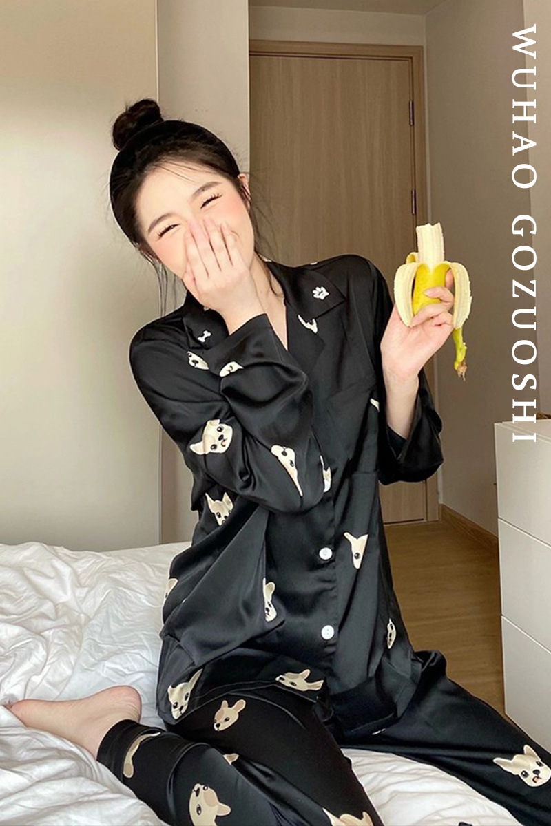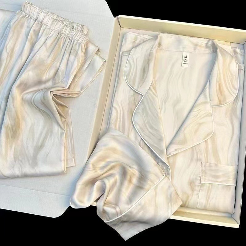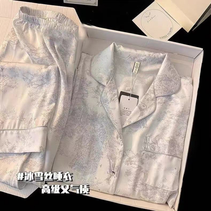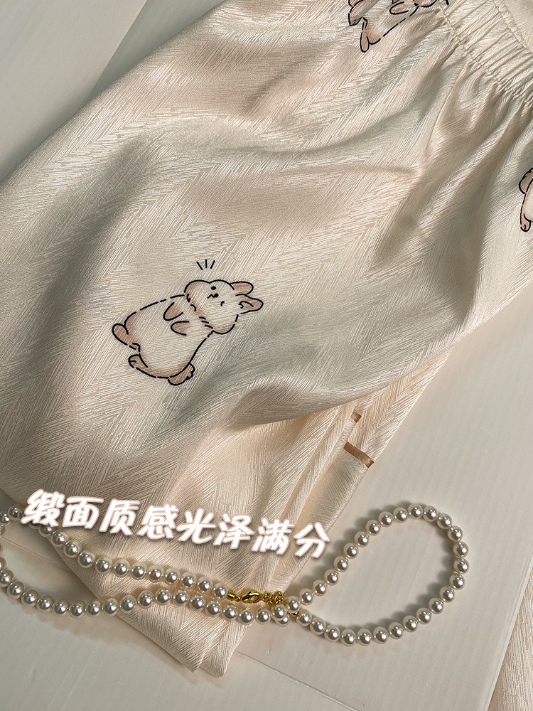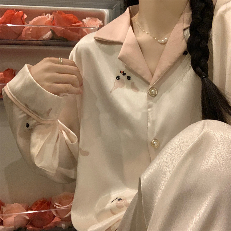 프랑스 고급 아이스 실크 긴 소매 파자마 여성의 봄과 가을 2025 새로운 도착 바지 학생 홈 의류 세트스토어 가기