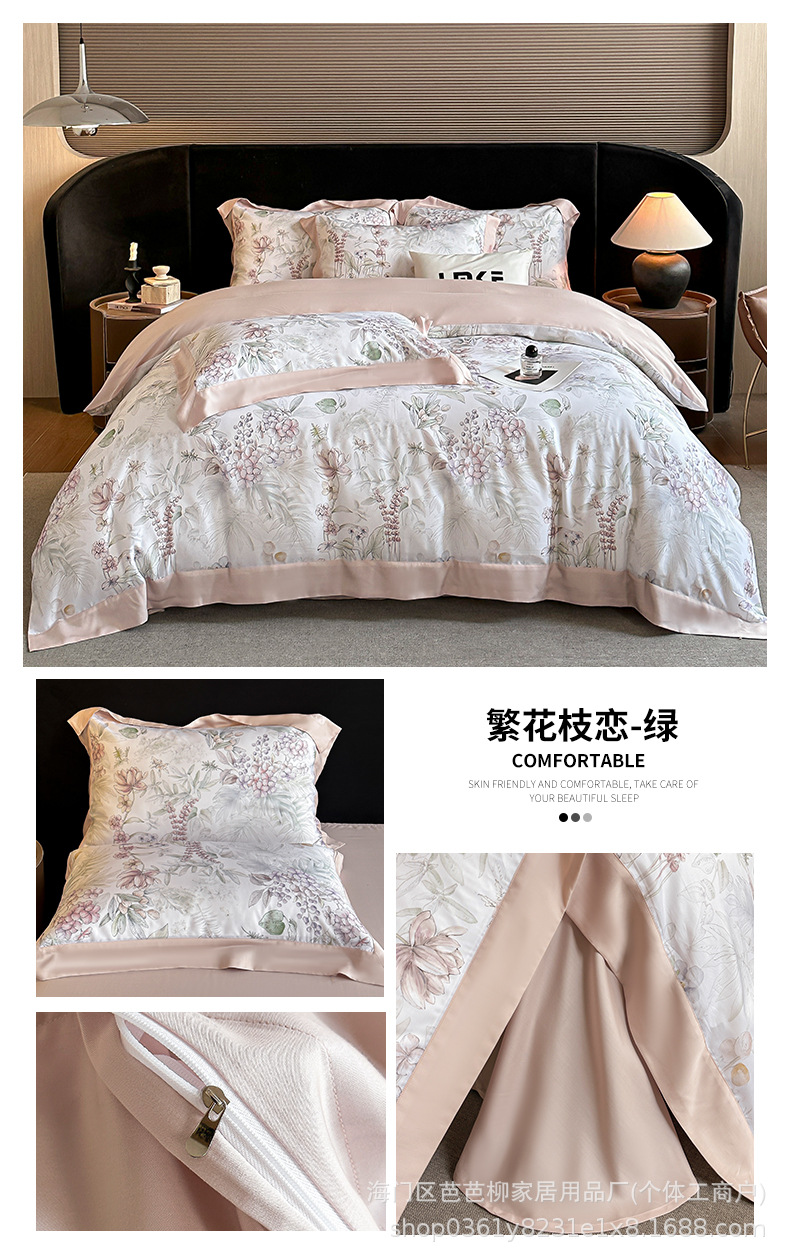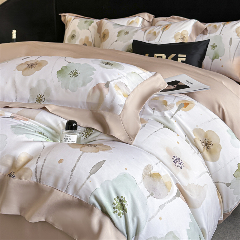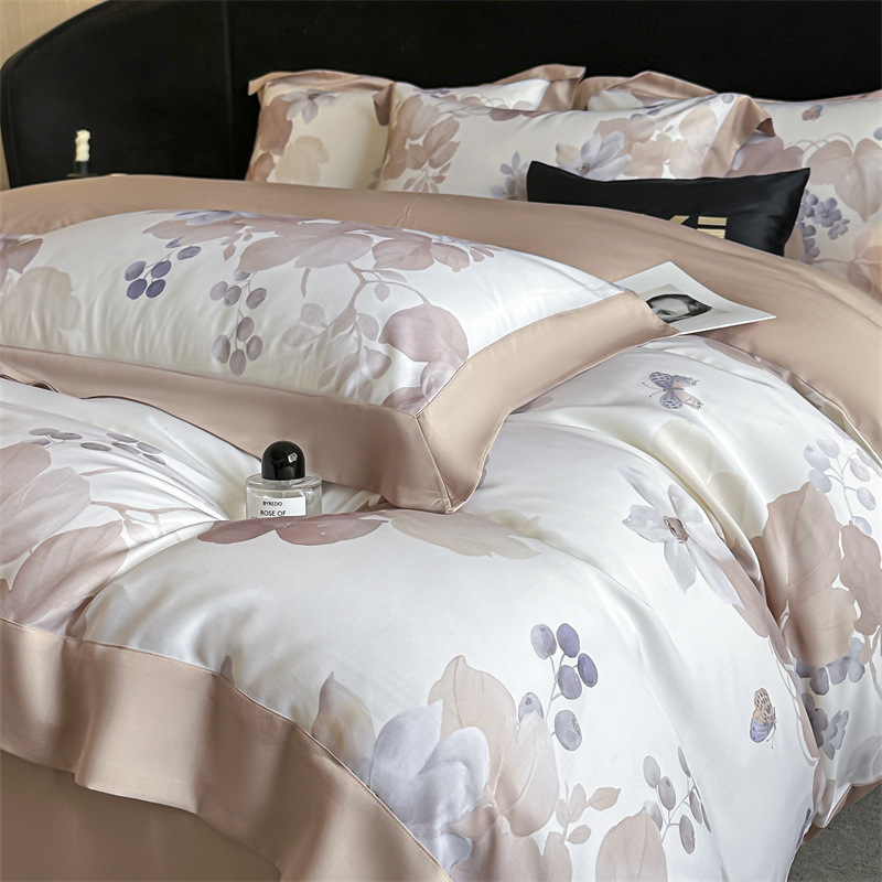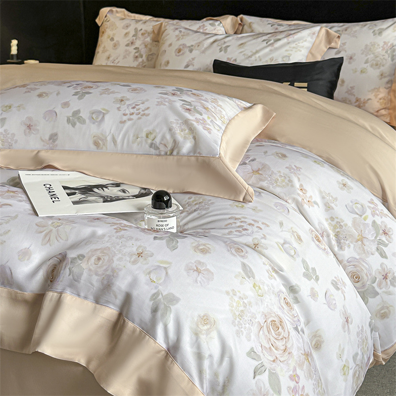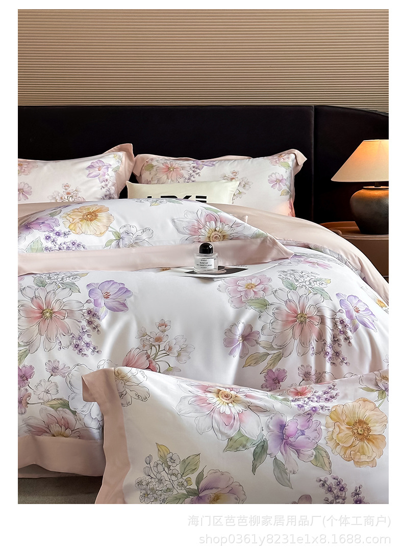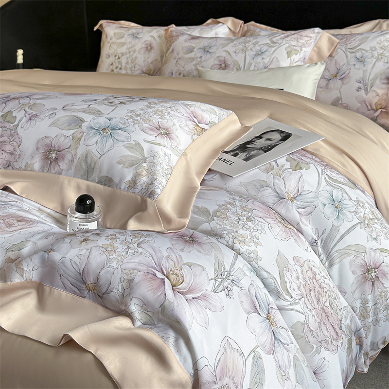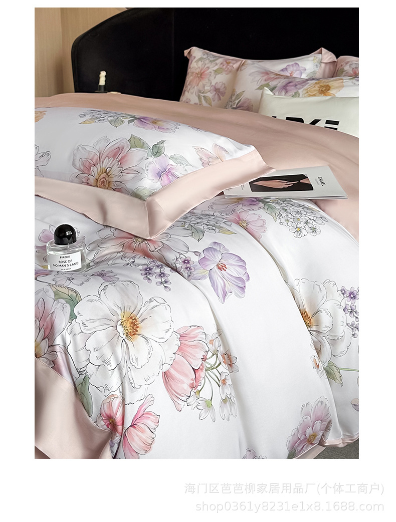 가벼운 럭셔리 프랑스 스타일 50 Lyocell Tencel 4 조각 세트 여름 이불 디지털 인쇄 아이스 실크 쿨 실키 잠자는 벌거 벗은 침구