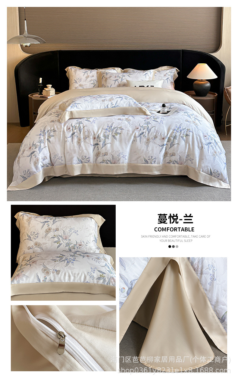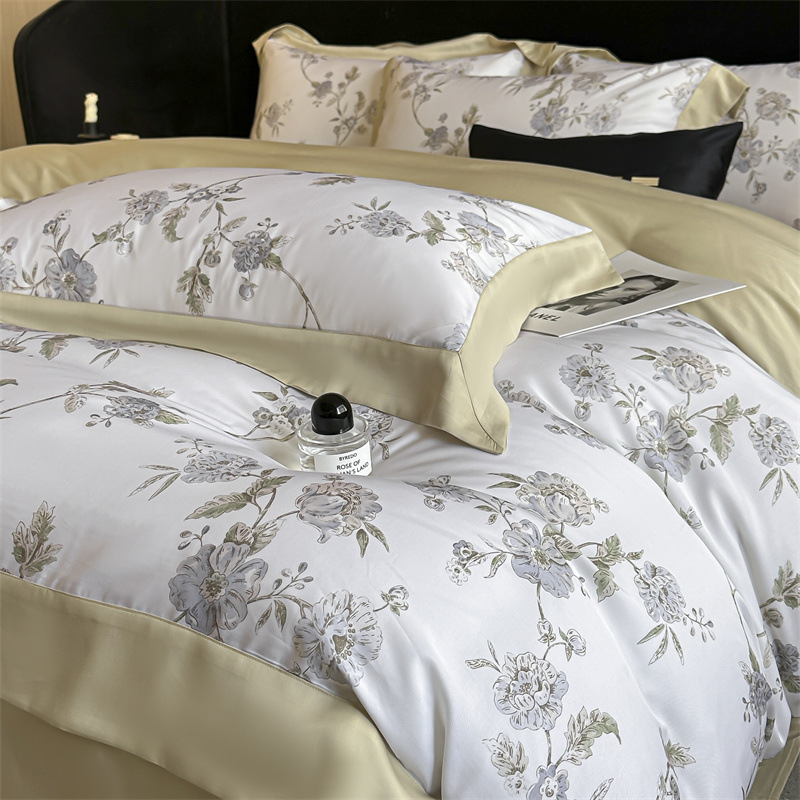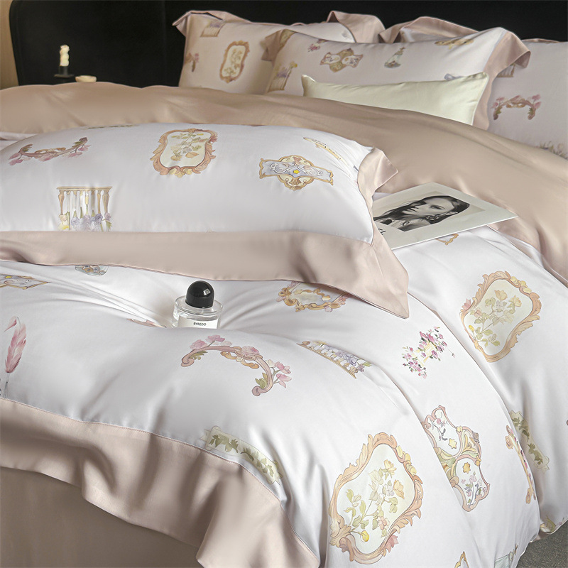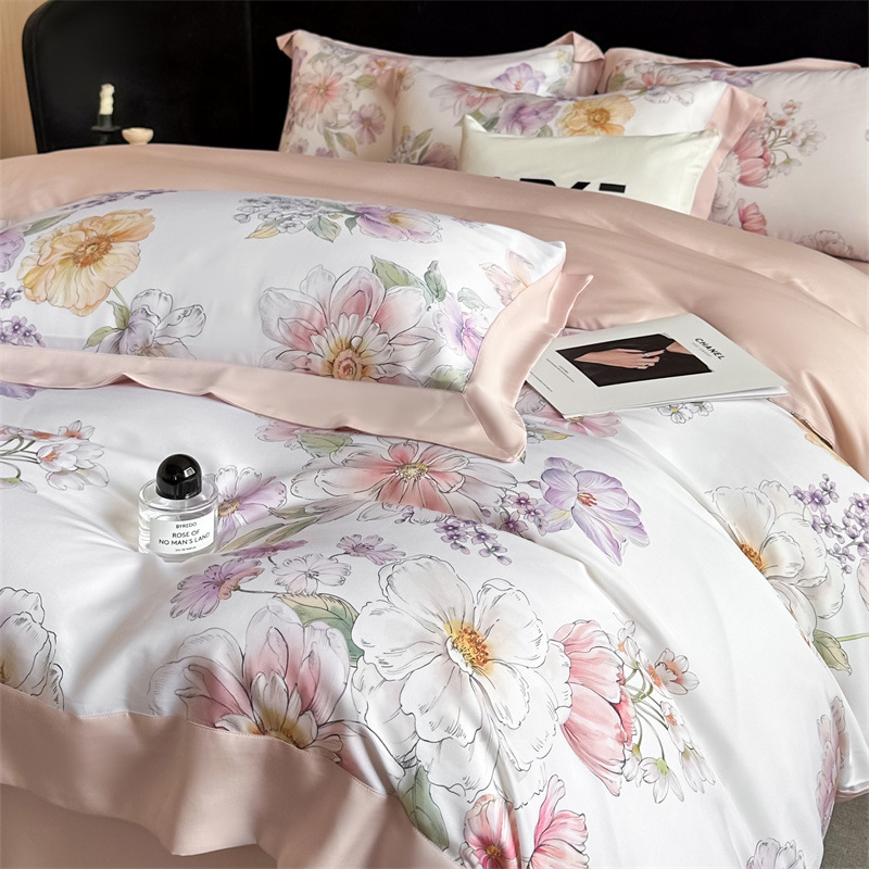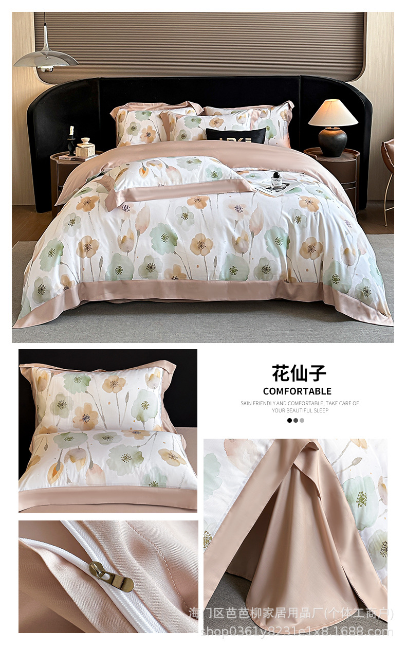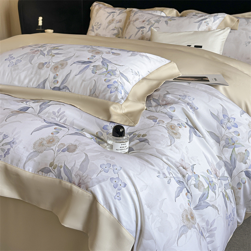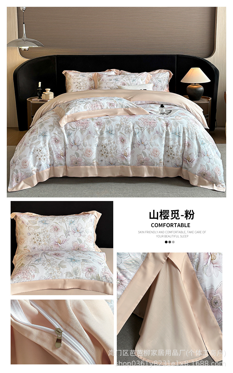 가벼운 럭셔리 프랑스 스타일 50 Lyocell Tencel 4 조각 세트 여름 이불 디지털 인쇄 아이스 실크 쿨 실키 잠자는 벌거 벗은 침구