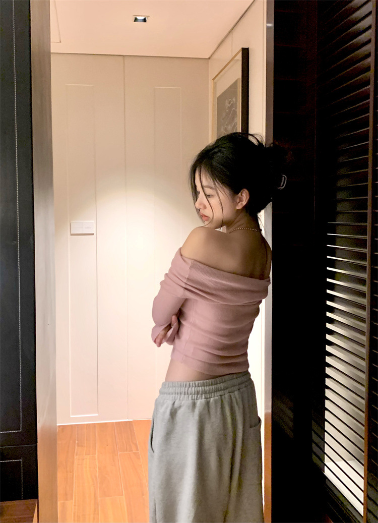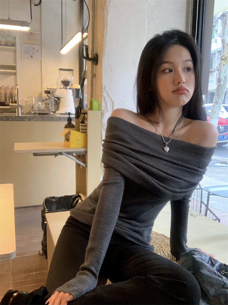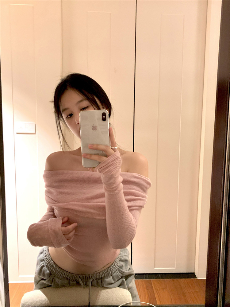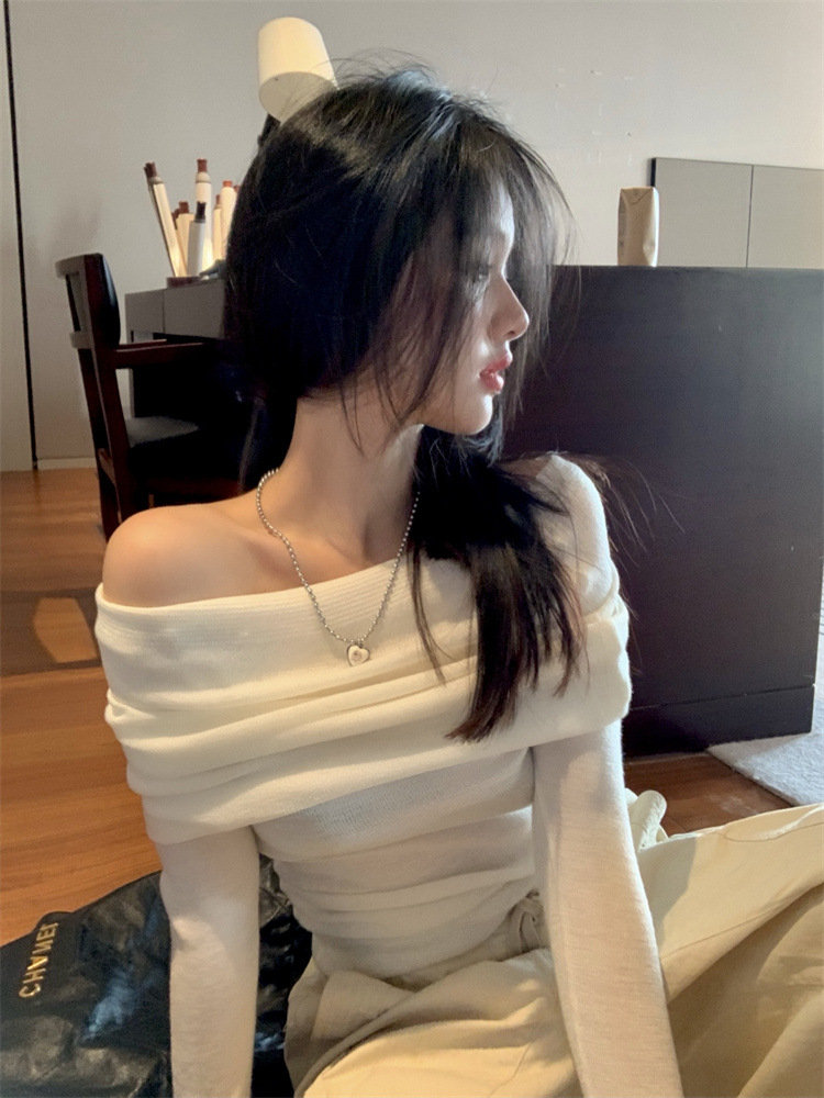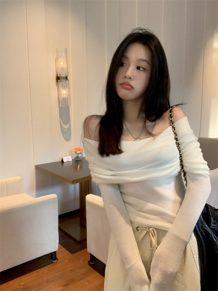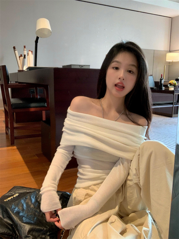 프랑스 세련된 우아한 부드러운 오프 숄더 니트웨어 여성용 스프링 슬림 핏 슬리밍 하이 엔드 플리츠 오프 숄더 탑스토어 가기